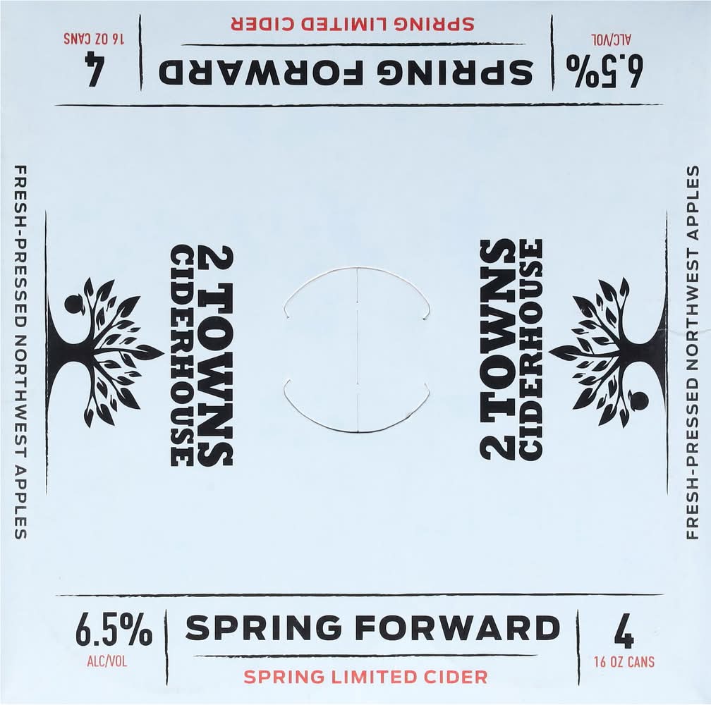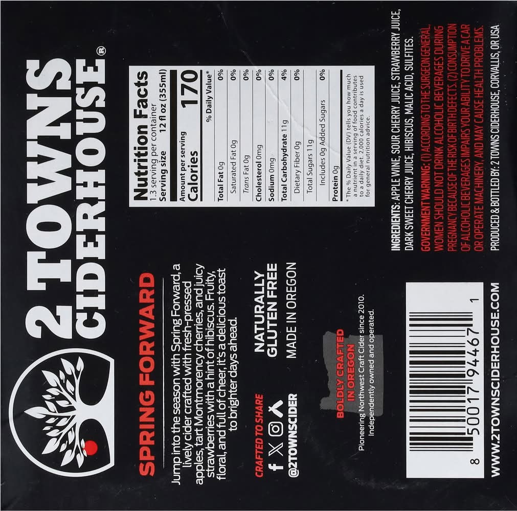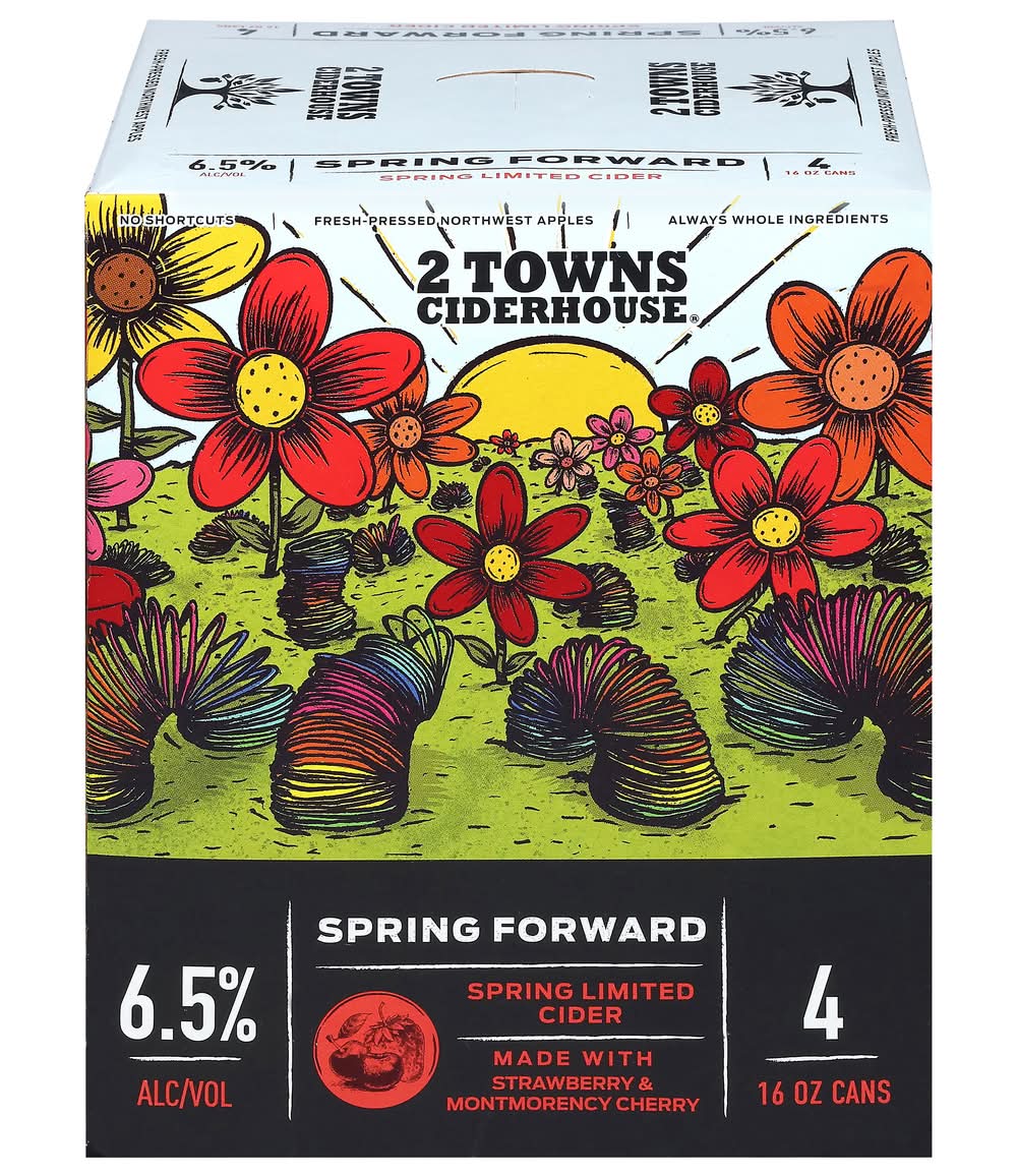 Spring Limited Cider Spring Forward Beer • Brand: 2 towns ciderhouse • Flavor: Strawberry-montmorency cherry • Pack size: 4 • gluten-free • Alcohol by volume: 6.5%