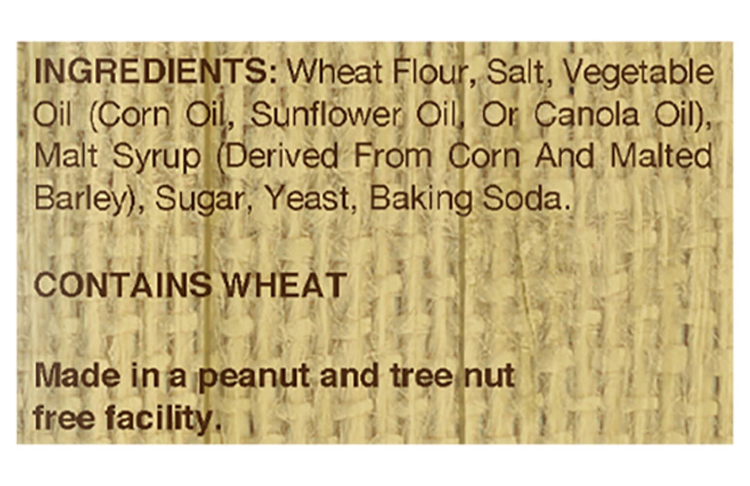 Ingredients: Wheat Flour, Salt, Vegetable Oil (Corn Oil, Sunflower Oil, or Canola Oil), Malt Syrup (Derived from Corn and Malted Barley), Sugar, Yeast, Baking Soda Contains: Wheat, Corn, Barley