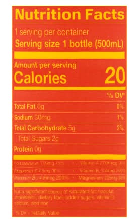 Ingredients: Water, Coconut Water Concentrate, Citric Acid, Dipotassium Phosphate, Trimagnesium Citrate, Natural Flavors, Sucralose, L-Isoleucine, L-Leucine, L-Valine, Acesulfame Potassium, Gum Arabic, Pyridoxine Hydrochloride (Vitamin B₆), Ester Gum, D-Alpha Tocopheryl Acetate (Vitamin E), Retinyl Palmitate (Vitamin A), Cyanocobalamin (Vitamin B₁₂) Contains: Coconut