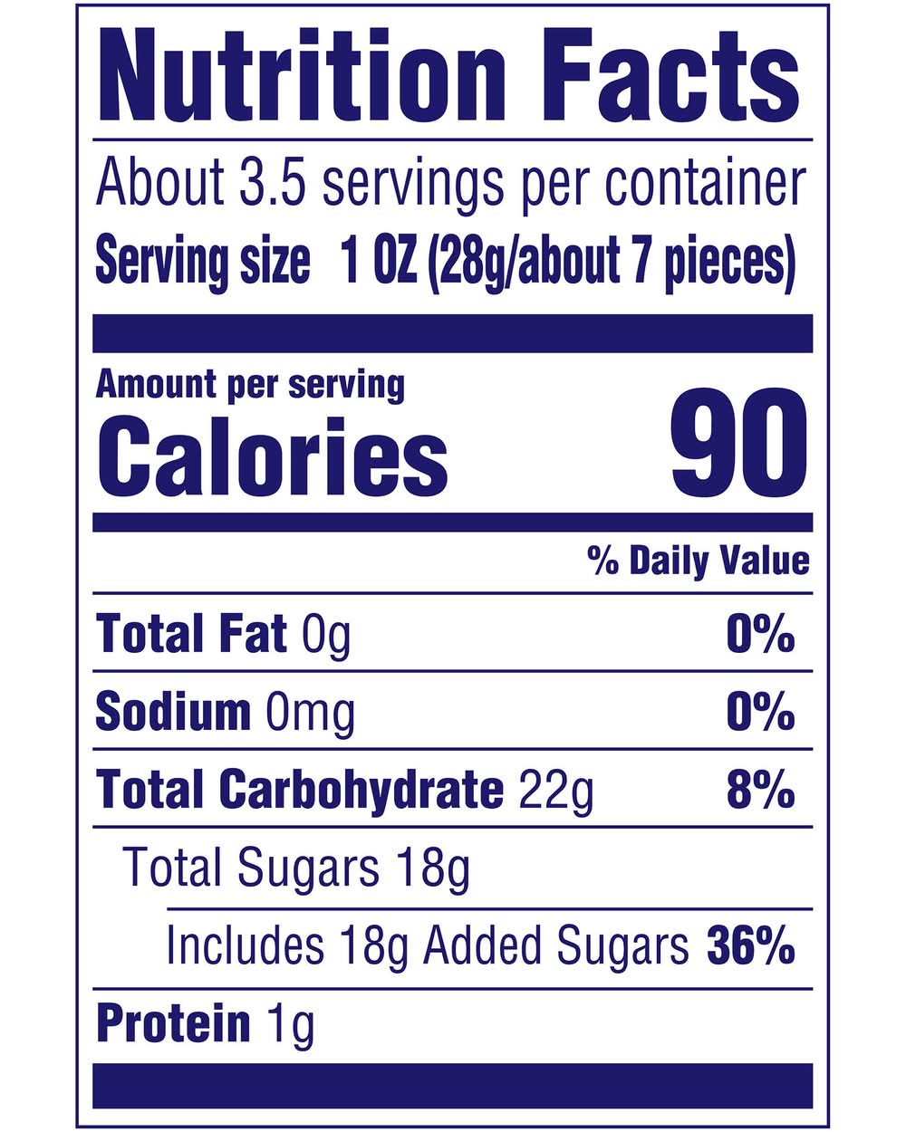 Ingredients: Corn Syrup, Sugar, Water, Gelatin, Modified Corn Starch; Less than 2% of: Citric Acid, Natural and Artificial Flavors, Mineral Oil, Colors (Red 40, Blue 1, Yellow 5), Carnauba Wax.