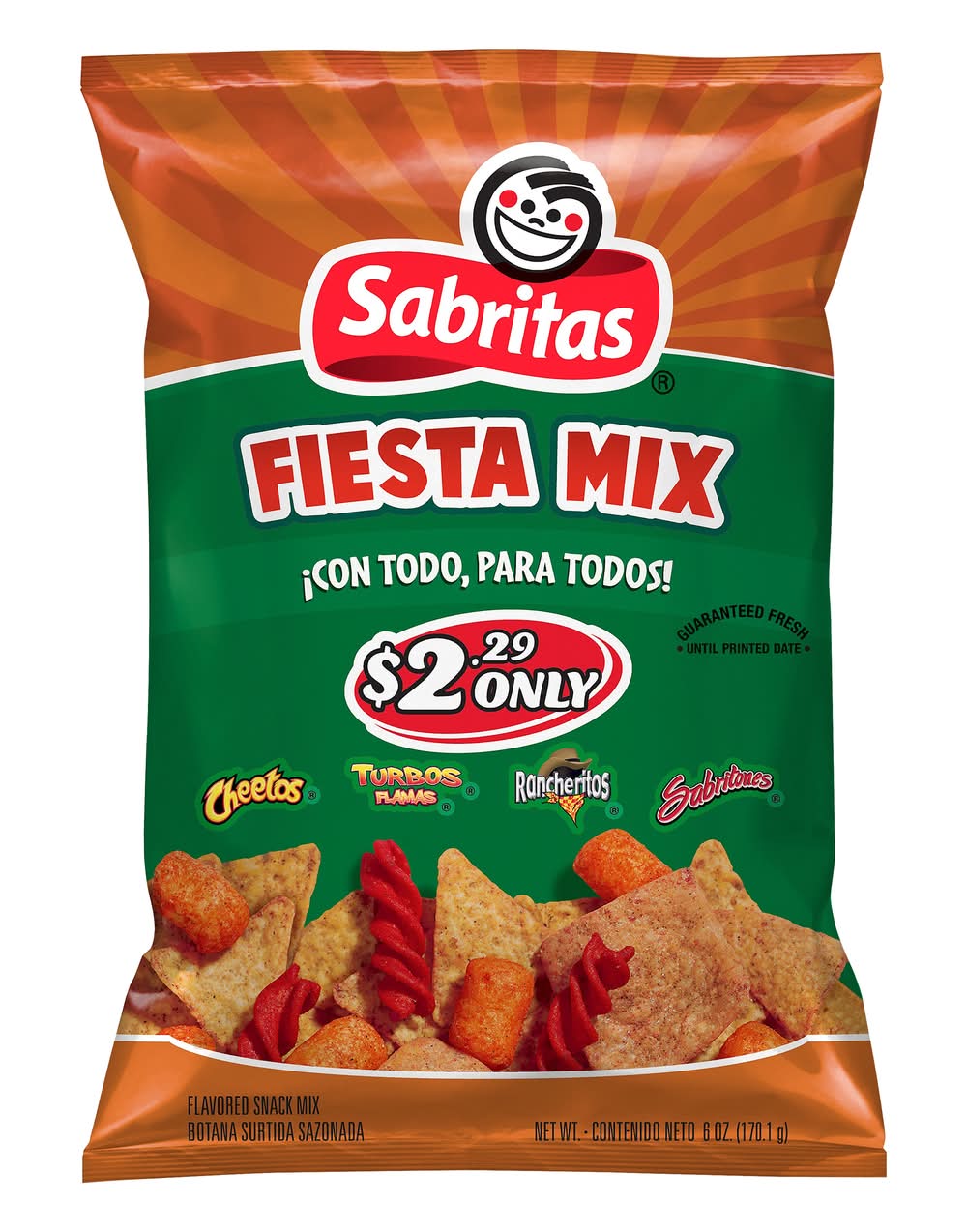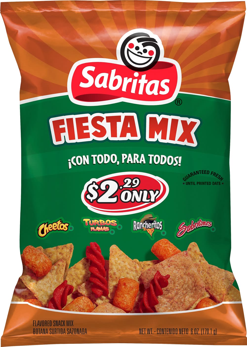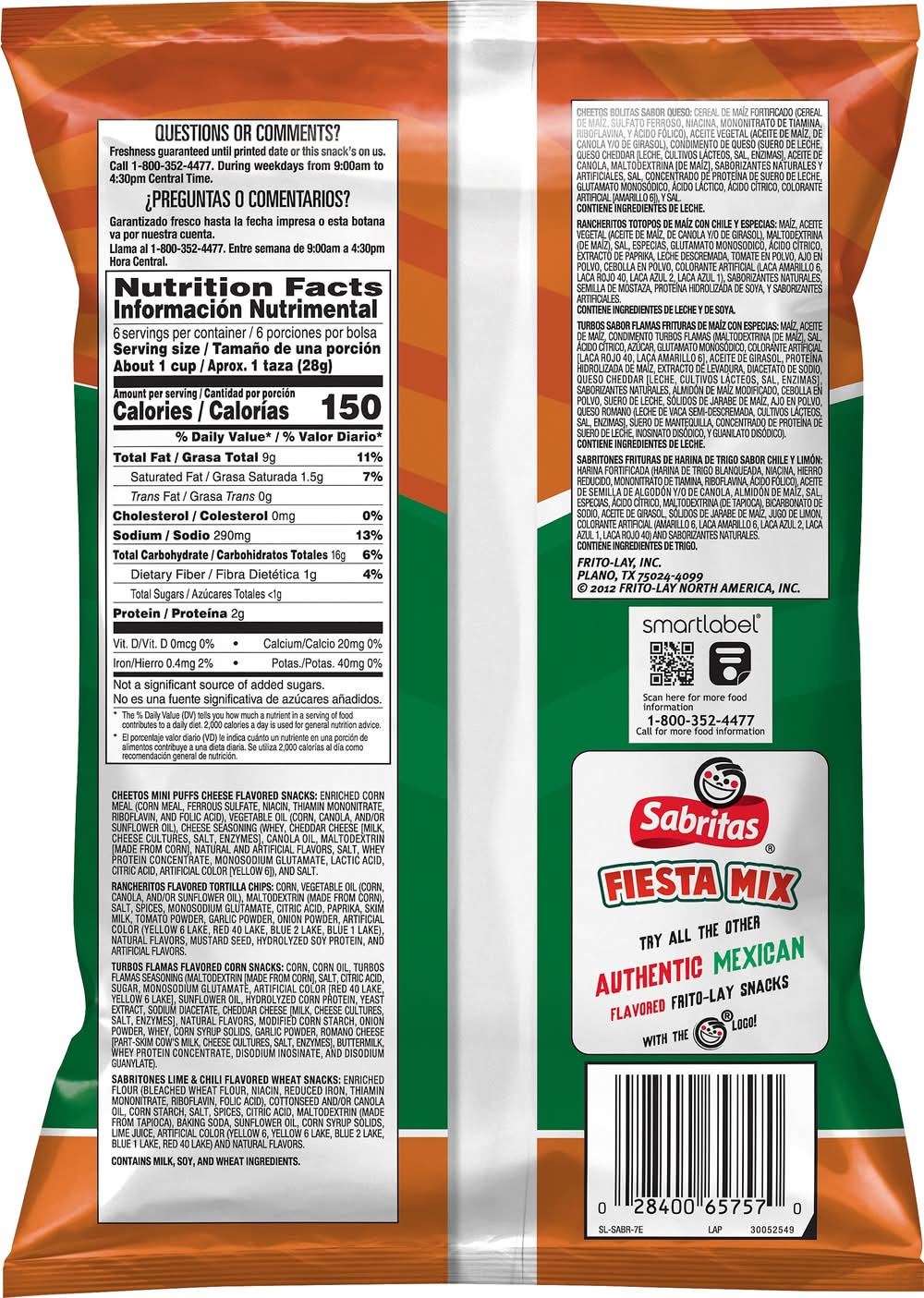 Ingredients: Cheetos Mini Puffs Cheese Flavored Snacks: Enriched Corn Meal (Corn Meal Ferrous Sulfate Niacin Thiamin Mononitrate Riboflavin and Folic Acid), Vegetable Oil (Corn Canola and/or Sunflower Oil), Cheese Seasoning (Whey Cheddar Cheese [Milk Cheese Cultures Salt Enzymes), Canola Oil, Maltodextrin [Made from Corn], Natural and Artificial Flavors, Salt, Whey Protein Concentrate, Monosodium Glutamate, Natural and Artificial Flavors, Lactic Acid, Citric Acid, Artificial Color [Yellow 6]), and Salt. Rancheritos Flavored Tortilla Chips: Corn, Vegetable Oil (Corn Canola and/or Sunflower Oil), Maltodextrin (Made from Corn), Salt, Spices, Monosodium Glutamate, Citric Acid, Paprika, Skim Milk, Tomato Powder, Garlic Powder, Onion Powder, Artificial Color ( Yellow 6 Lake Red 40 Lake Blue 2 Lake Blue 1 Lake), Natural Flavors, Mustard Seed, Hydrolyzed Soy Protein, and Artificial Flavors. Turbos Flamas Flavored Corn Snacks: Corn, Corn Oil, Turbos Flamas Seasoning (Maltodextrin [Made from Corn] Salt Citric Acid Sugar Monosodium Glutamate Artificial Color [Red 40 Lake Yellow 6 Lake] Sunflower Oil Hydrolyzed Corn Protein Yeast Extract Sodium Diacetate Cheddar Cheese [Milk Cheese Cultures Salt Enzymes] Natural Flavors Modified Corn Starch Onion Powder Whey Corn Syrup Solids Garlic Powder Romano Cheese [Part-Skim Cow's Milk Cheese Cultur, Cottonseed and/or Canola Oil, Corn Starch, Salt, Spices, Citric Acid, Maltodextrin (Made from Tapioca), Baking Soda, Sunflower Oil, Corn Syrup Solids, Lime Juice, Artificial Color (Yellow 6 Yellow 6 Lake Blue 2 Lake Blue 1 Lake Red 40 Lake) and Natural Flavors Contains: Milk, Soybeans, Wheat