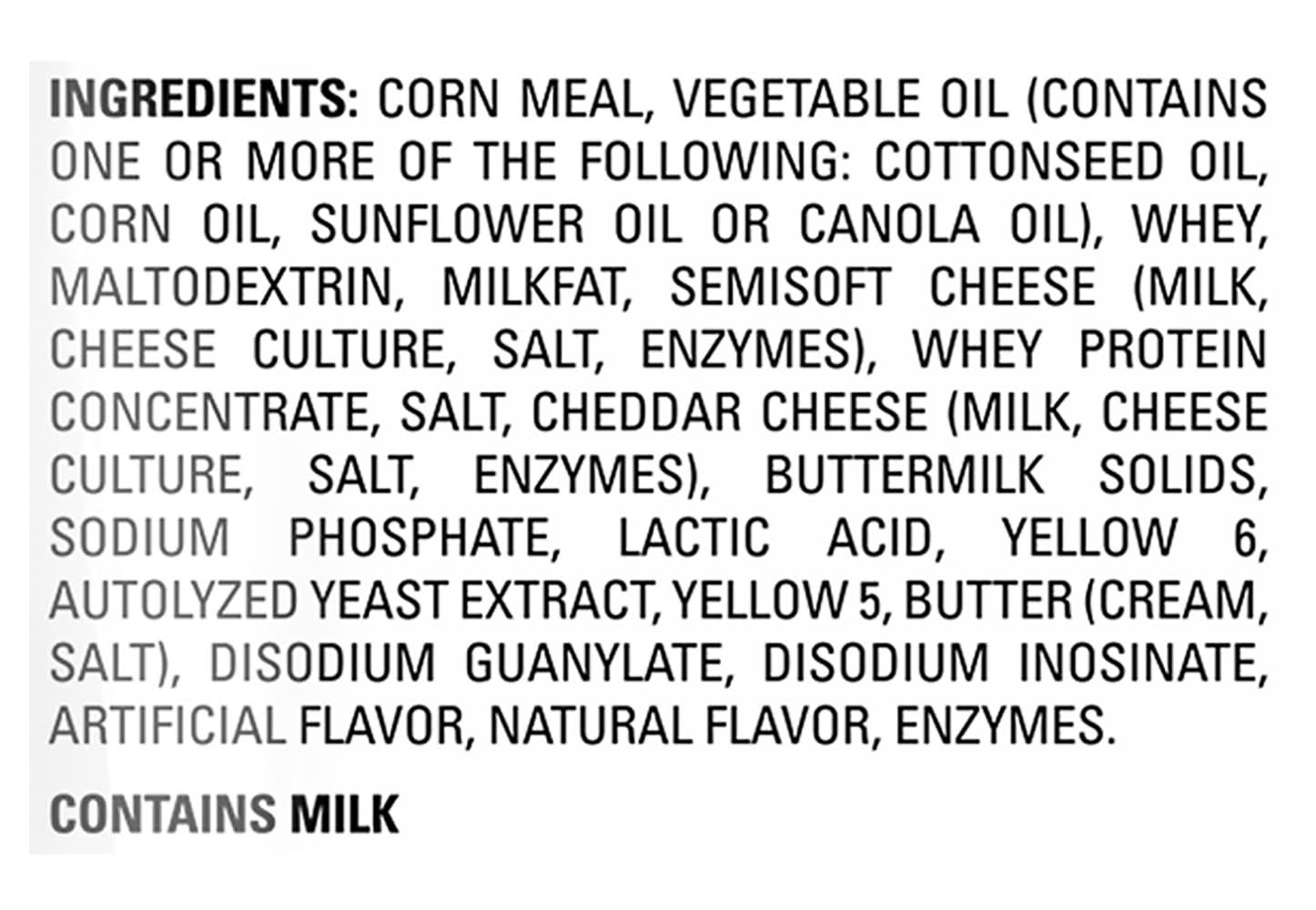 Ingredients: Corn Meal, Vegetable Oil (Contains One or More of the Following: Cottonseed Oil, Corn Oil, Sunflower Oil or Canola Oil), Whey, Maltodextrin, Milkfat, Semisoft Cheese (Milk, Cheese Culture, Salt, Enzymes), Whey Protein Concentrate, Salt, Cheddar Cheese (Milk, Cheese Culture, Salt, Enzymes), Buttermilk Solids, Sodium Phosphate, Lactic Acid, Yellow 6, Autolyzed Yeast Extract, Yellow 5, Butter (Cream, Salt), Disodium Guanylate, Disodium Inosinate, Artificial Flavor, Natural Flavor, Enzymes Contains: Milk