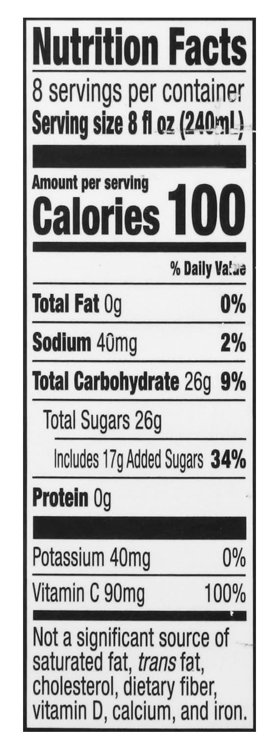 Ingredients: Filtered Water, Grape Juice from Concentrate, Sugar, Clarified Peach Juice from Concentrate, Cranberry Juice from Concentrate, Citric Acid, Natural Flavors, Ascorbic Acid (Vitamin C), Sodium Citrate, Fruit Juice (for Color).