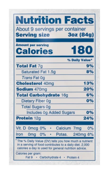 Ingredients: Boneless Skinless Chicken Breast with Rib Meat, Wheat Flour, Water. Contains 2% or Less of Salt, Garlic Powder, Spices, Dextrose, Natural Extractives of Paprika, Spice Extractives, Onion Powder, Natural Paprika and Annatto Extracts Contains: Wheat