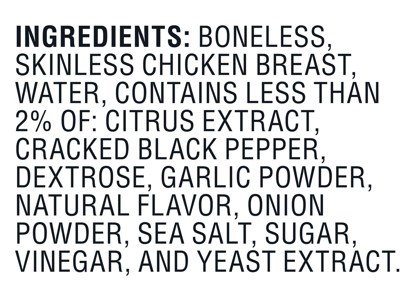 Ingredients: Boneless, Skinless Chicken Breast, Water, Contains Less than 2% of: Citrus Extract, Cracked Black Pepper, Dextrose, Garlic Powder, Natural Flavor, Onion Powder, Sea Salt, Sugar, Vinegar, and Yeast Extract