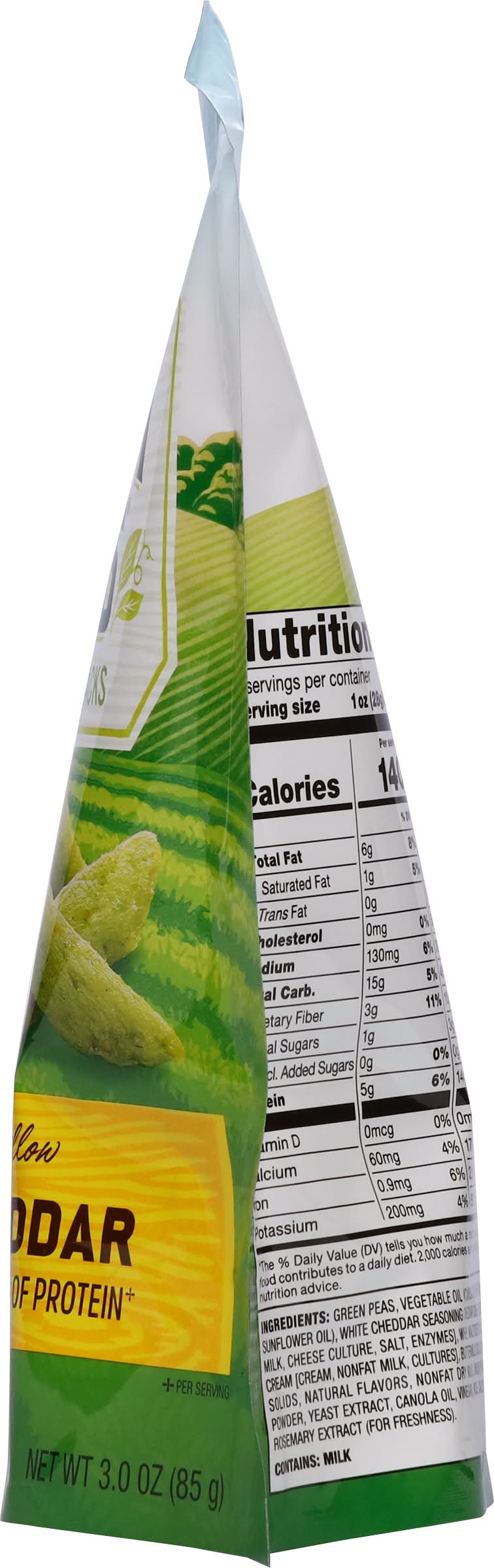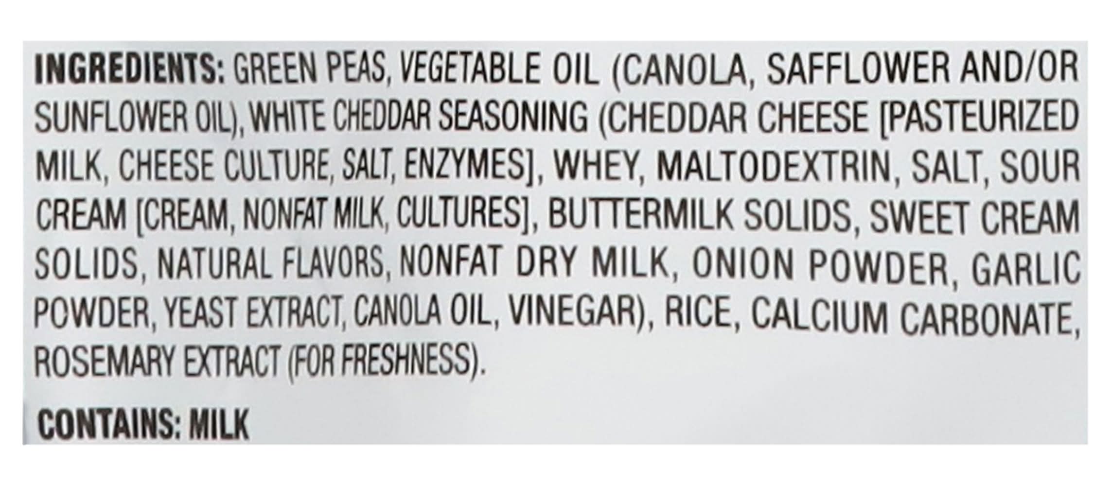Ingredients: Green Peas, Vegetable Oil (Canola, Safflower and/or Sunflower Oil), White Cheddar Seasoning (Cheddar Cheese [Pasteurized Milk, Cheese Culture, Salt, Enzymes], Whey, Maltodextrin, Salt, Sour Cream [Cream, Nonfat Milk, Cultures], Buttermilk Solids, Sweet Cream Solids, Natural Flavors, Nonfat Dry Milk, Onion Powder, Garlic Powder, Yeast Extract, Canola Oil, Vinegar), Rice, Calcium Carbonate, Rosemary Extract (for Freshness) Contains: Milk