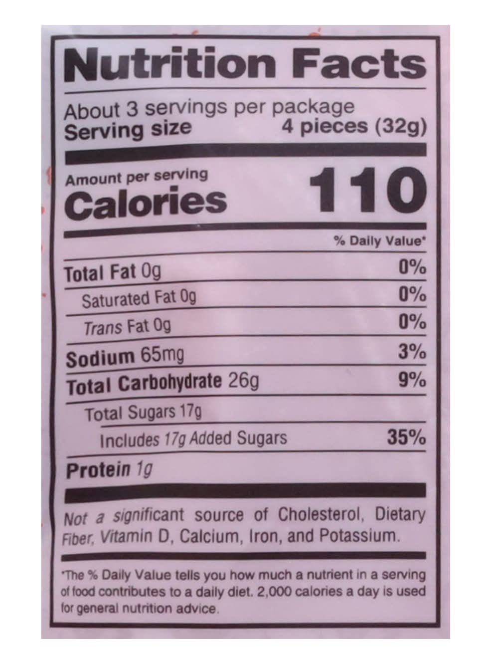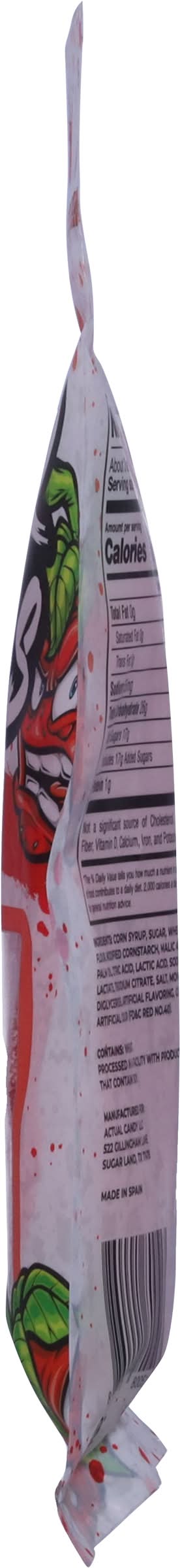 Ingredients: Corn Syrup, Sugar, Wheat Flour, Modified Cornstarch, Malic Acid, Palm Oil, Citric Acid, Lactic Acid, Sodium Lactate, Trisodium Citrate, Salt, Mono- and Diglycerides, Artificial Flavoring, Glycerin, Artificial Color (FD&C Red 40) Contains: Wheat, Soybeans