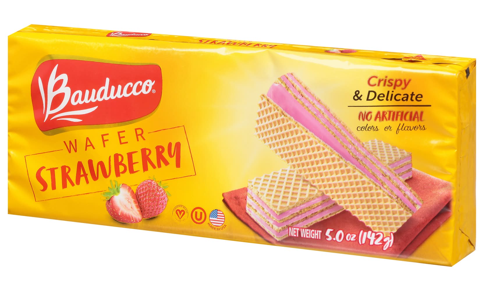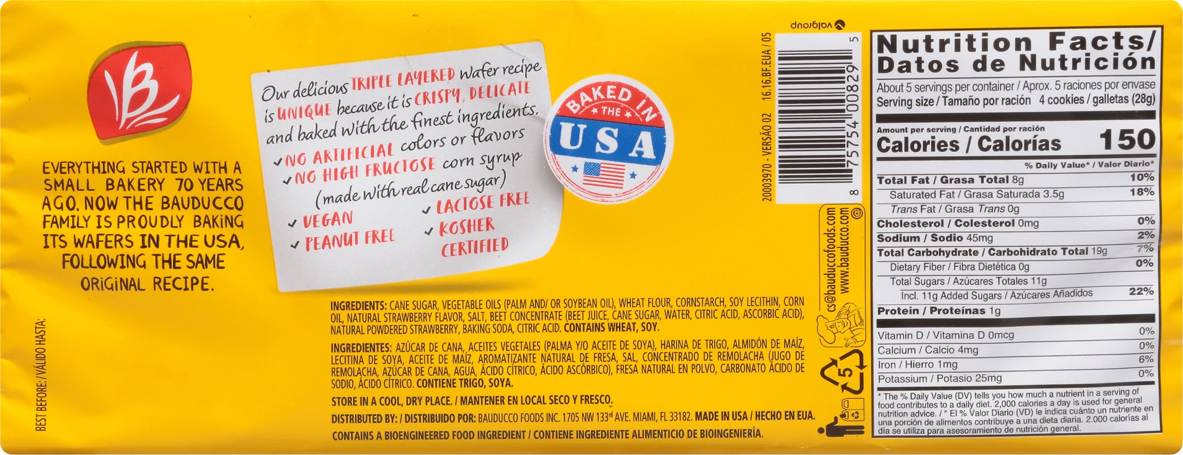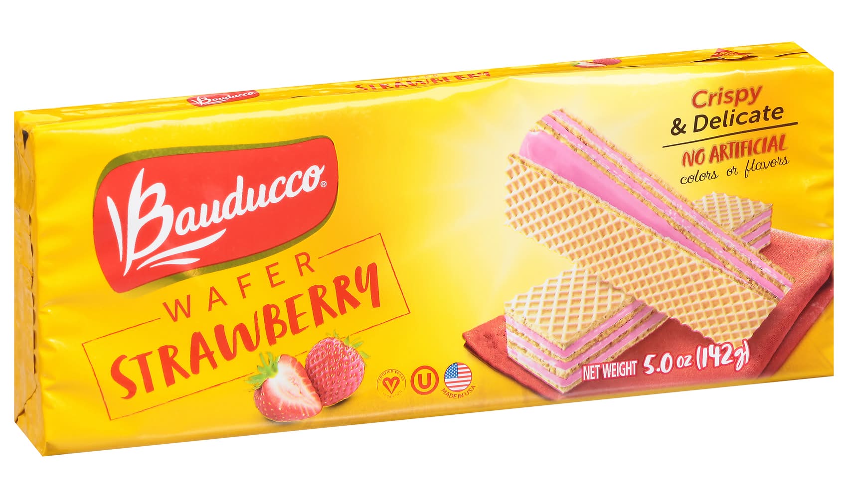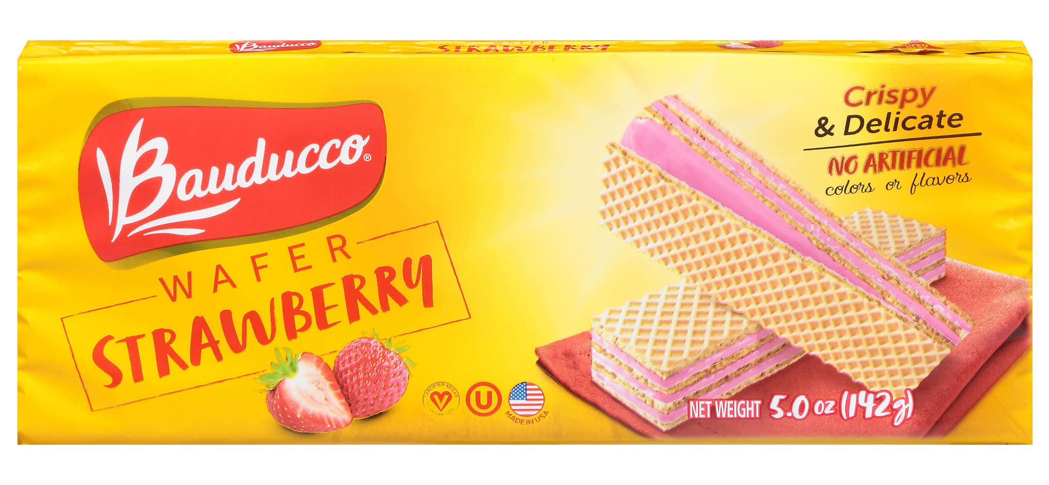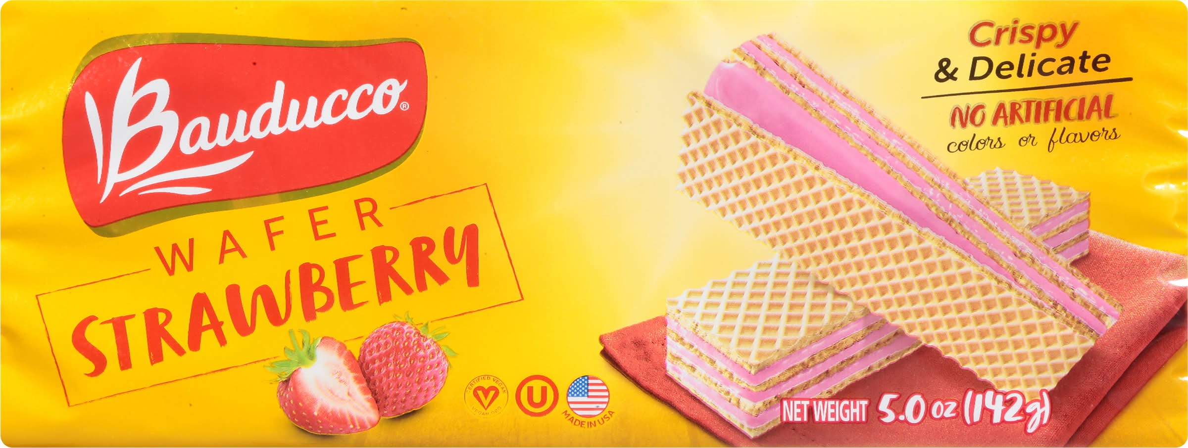 No artificial colors or flavors peanut free lactose free. Contains a bioengineered food ingredient. Crispy & delicate. Everything started with a small bakery 70 years ago. Now the bauducco family is proudly baking its wafers in the USA, following the same original recipe. Our delicious triple layered wafer recipe is unique because it is crispy, delicate and baked with the finest ingredients. No high fructose corn syrup (made with real cane sugar). Dispose of properly. Made in usa. Baked in the USA. • Flavor: Strawberry • Packaging: Reusable