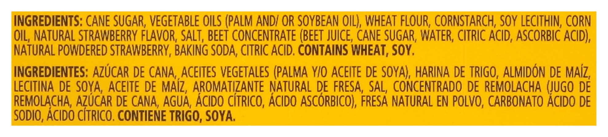 Ingredients: Cane Sugar, Vegetable Oils (Palm and/or Soybean Oil), Wheat Flour, Cornstarch, Soy Lecithin, Corn Oil, Natural Strawberry Flavor, Salt, Beet Concentrate (Beet Juice Cane Sugar Water Citric Acid Ascorbic Acid), Natural Powdered Strawberry, Baking Soda, Citric Acid Contains: Wheat, Soybeans, Corn