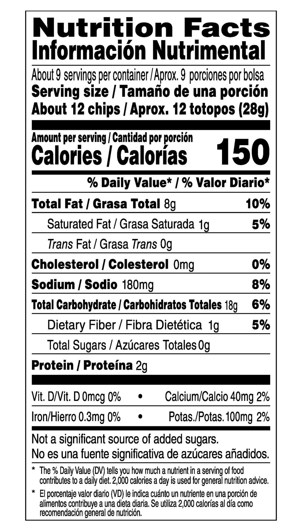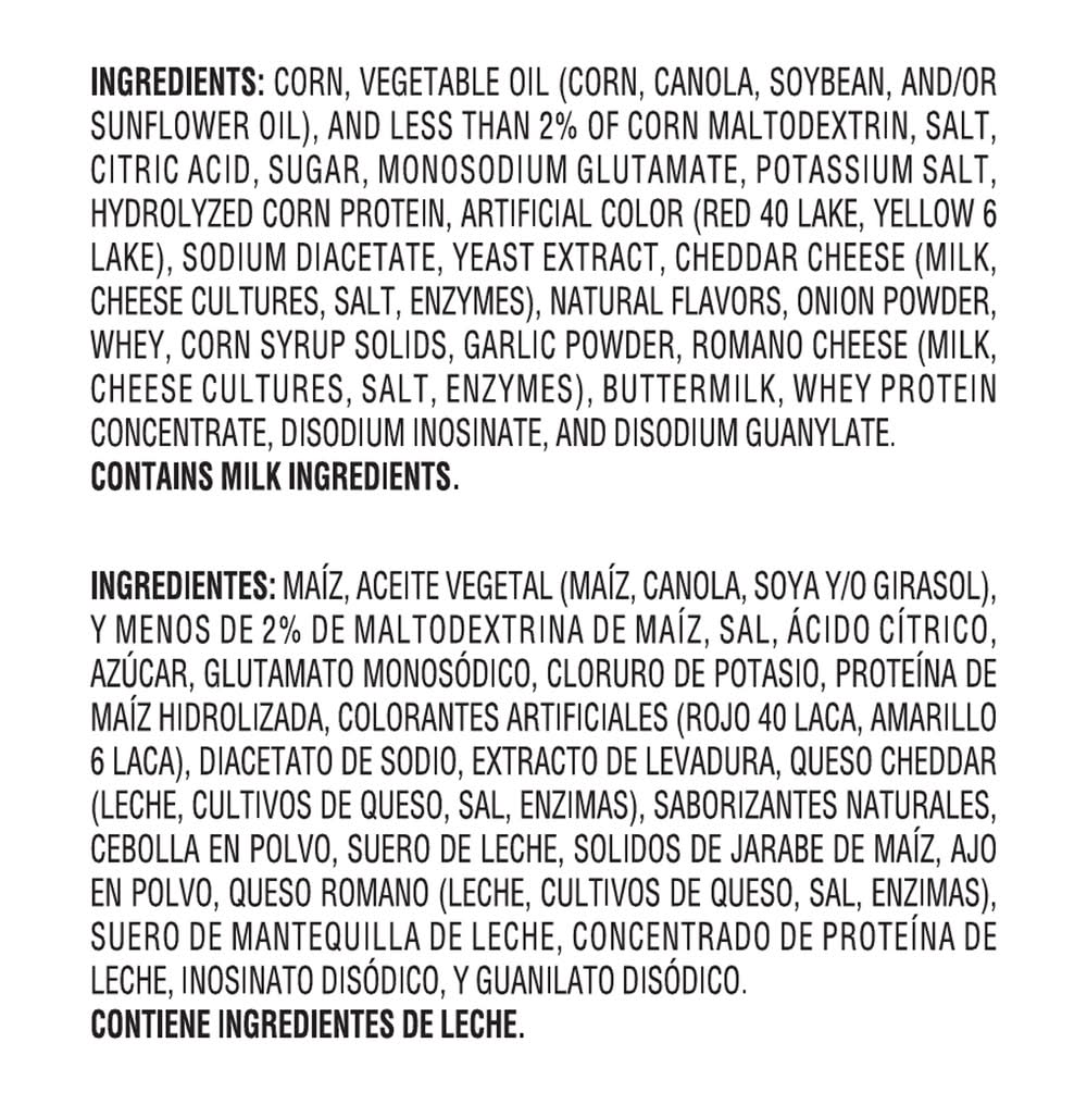 Ingredients: Corn, Vegetable Oil (Corn, Canola, Soybean, and/or Sunflower Oil), and Less than 2% of Corn Maltodextrin, Salt, Citric Acid, Sugar, Monosodium Glutamate, Potassium Salt, Hydrolyzed Corn Protein, Artificial Color (Red 40 Lake, Yellow 6 Lake), Sodium Diacetate, Yeast Extract, Cheddar Cheese (Milk, Cheese Cultures, Salt, Enzymes), Natural Flavors, Onion Powder, Whey, Corn Syrup Solids, Garlic Powder, Romano Cheese (Milk Cheese Cultures, Salt, Enzymes), Buttermilk, Whey Protein Concentrate, Disodium Inosinate, and Disodium Guanylate Contains: Milk, Soybeans