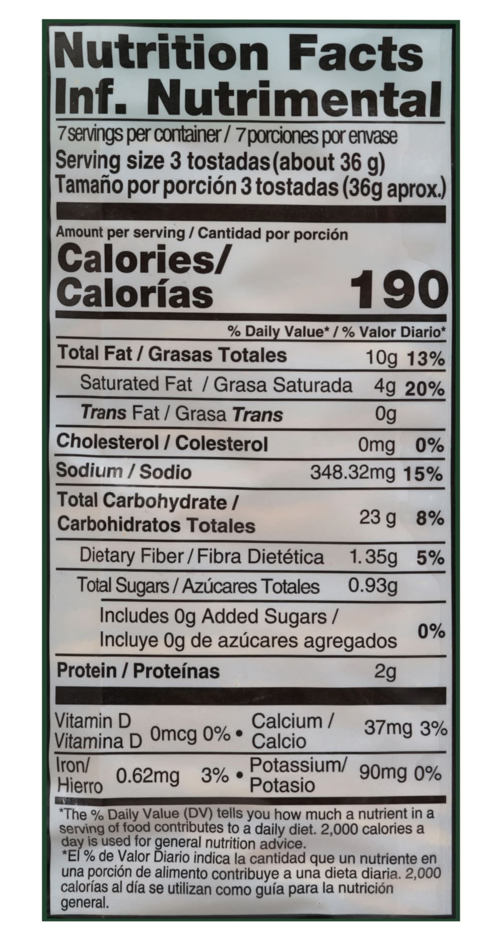 Ingredients: Nixtamalized Corn Flour, Vegetable Oil (Palm Olein), Sea Salt, Dried Jalapeno Pepper, Corn Solids, Citric Acid, Spices, Glycerin, Silicon Dioxide and FD&C Yellow 5 (Tartrazine)
