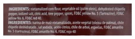 Ingredients: Nixtamalized Corn Flour, Vegetable Oil (Palm Olein), Dehydrated Chipotle Pepper, Iodized Salt, Citric Acid, Tree Pepper, Spice, FD&C Yellow 5 (Tartrazine), FD&C Yellow 6, FD&C Red 40