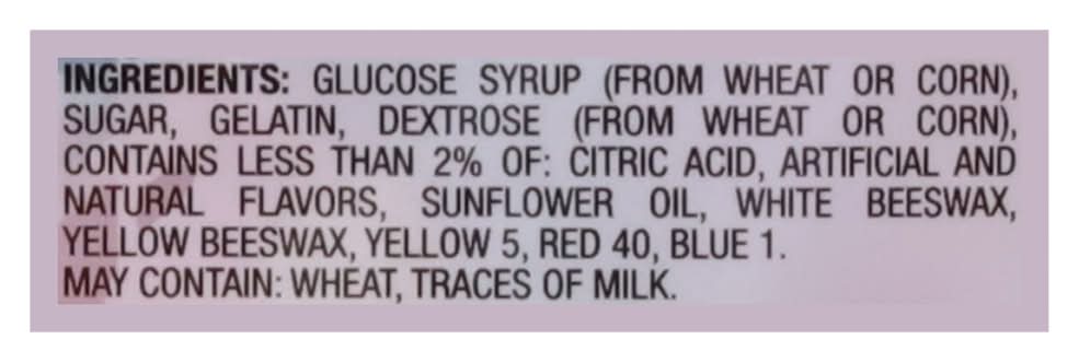 Ingredients: Glucose Syrup (from Wheat or Corn), Sugar, Gelatin, Dextrose (from Wheat or Corn), Contains Less than 2% of: Citric Acid, Artificial and Natural Flavors, Sunflower Oil, White Beeswax, Yellow Beeswax, Yellow 5, Red 40, Blue 1 Contains: Wheat, Milk, Corn