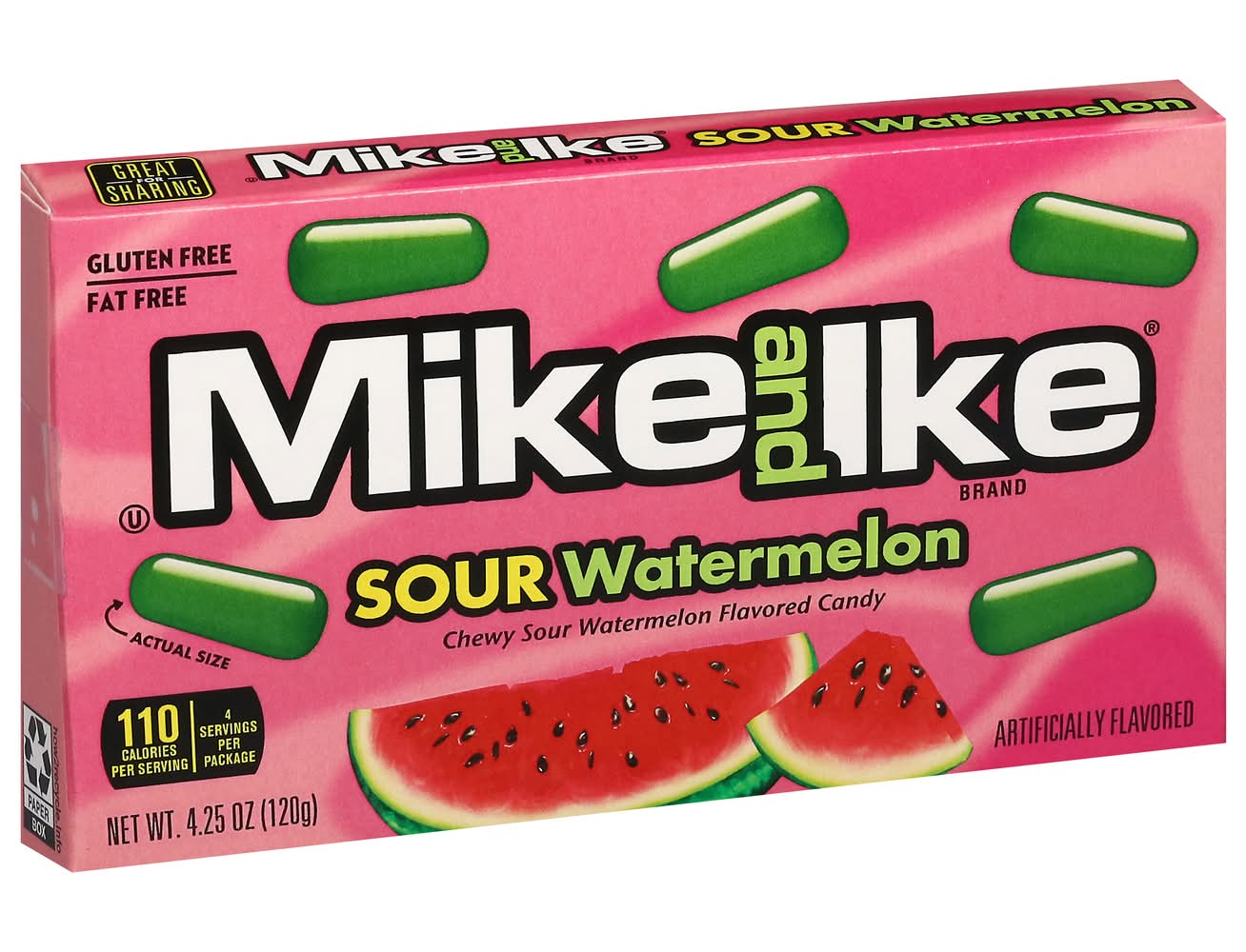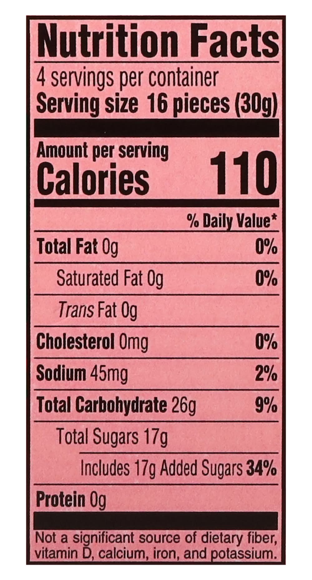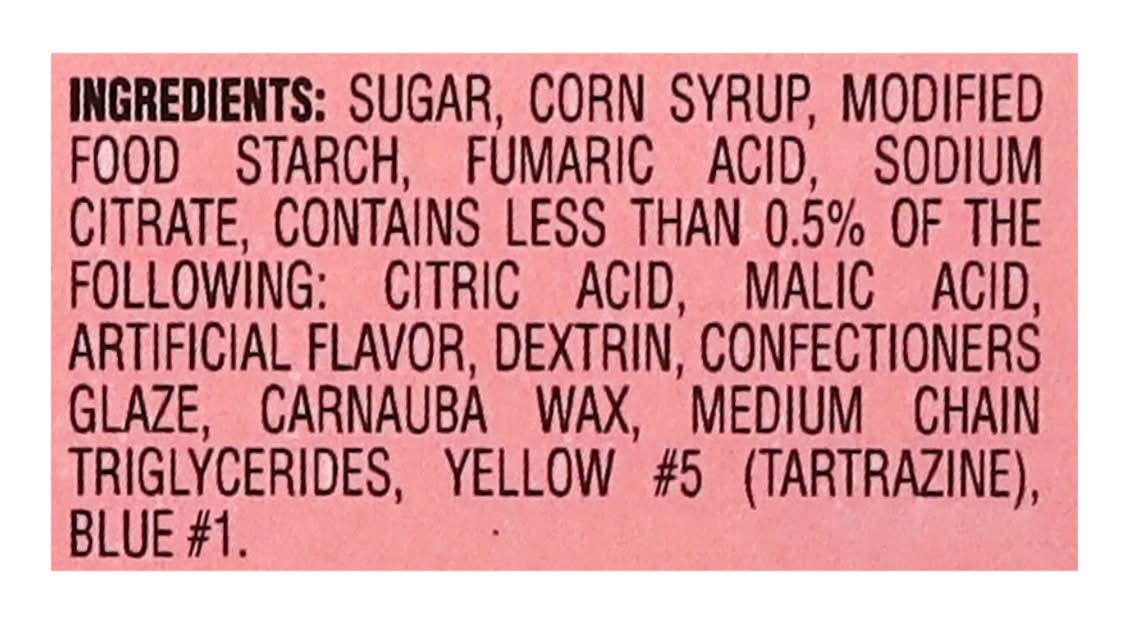 Ingredients: Sugar, Corn Syrup, Modified Food Starch, Fumaric Acid, Sodium Citrate, Contains Less than 0.5% of the Following: Citric Acid, Malic Acid, Artificial Flavor, Dextrin, Confectioners Glaze, Carnauba Wax, Medium Chain Triglycerides, Yellow 5 (Tartrazine), Blue 1. Contains: Corn