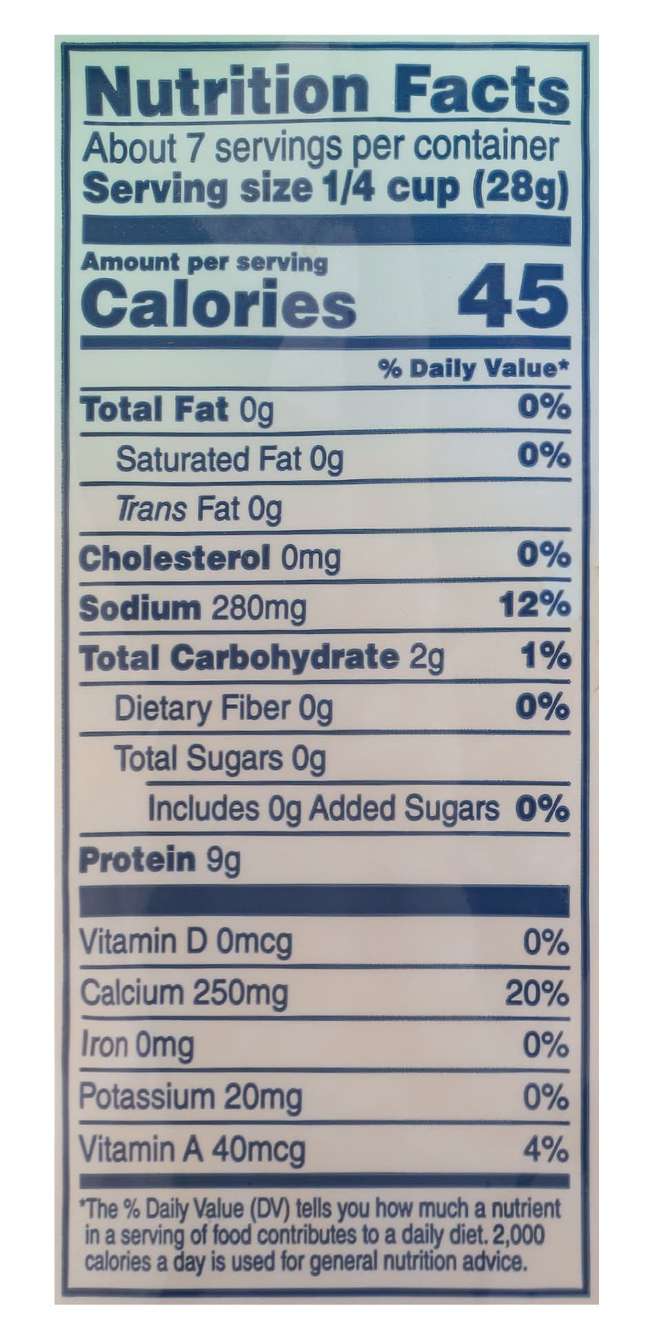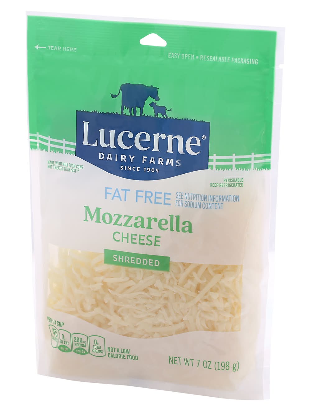 Ingredients: Fat Free Mozzarella Cheese (Cultured Pasteurized Skim Milk, Salt, Enzymes, Vitamin A Palmitate), Anticake (Potato Starch, Powdered Cellulose), Natamycin (Mold Inhibitor). Contains: Milk