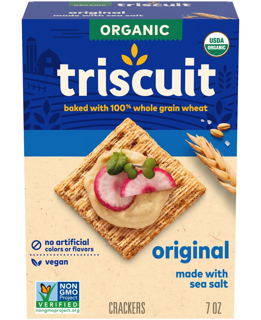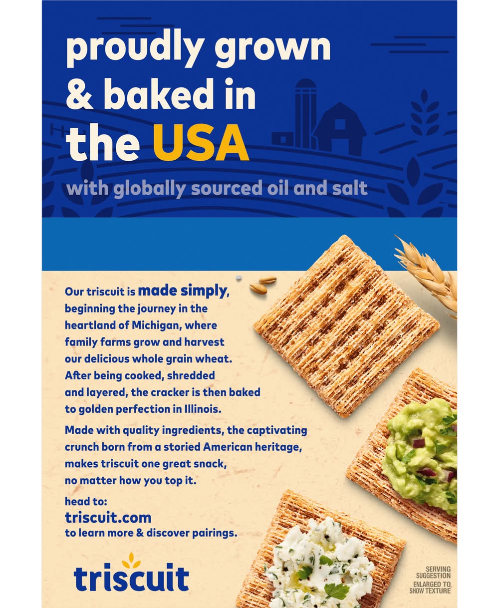 Triscuit Organic Original Whole Grain Wheat Crackers are made simply with quality ingredients. Baked to perfection, these vegan snack crackers use 100% whole grain wheat proudly grown in the USA, sunflower oil, and sea salt for a classic flavor. The square snack crackers are made with their signature woven texture for a satisfying crunch. Organic Triscuit crackers are USDA Certified Organic, vegan, Non-GMO Project Verified, made without artificial colors or flavors and a good source of dietary fiber (see Nutrition information for fat content) for delicious, wholesome goodness. Enjoy the crunch of these delicious organic crackers on their own, or top them with your favorite cheese, fruit, or flavorful spreads. Triscuit cracker snacks cover all your organic snacking needs, whether you need lunch snacks for kids, vegan snacks for adults or on the go snacks for traveling. Serve them at parties on your meat and cheese tray as fun, easy appetizers. Create a delicious vegan food charcuterie board featuring Triscuit original vegan crackers alongside your favorite vegan cheese, vegan meat, dips, fruit and vegetables. Mondelez Global LLC, East Hanover, NJ, 07936