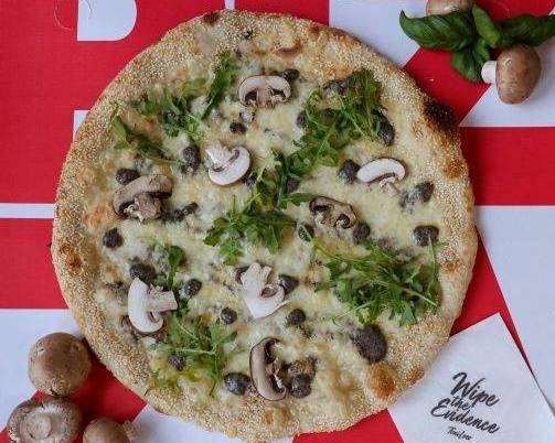Crème Fraiche ( base ),Crema di Tartufo, Mozzarella,Bufala, Truffle paste, Fresh Rukola Parsley,Parmesan, Truffle oil ( at the end ) - 36cm.