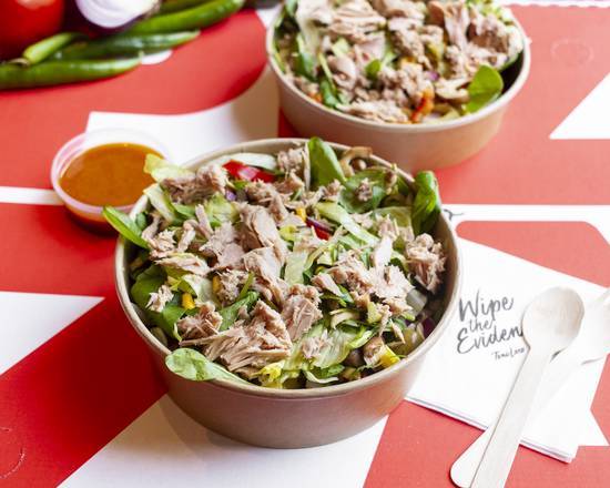 Chopped Salad with Lettuce, Arugula & Spinach, Tuna, Roasted Artichoke, Red Bell Pepper, Shiitaki Mushroom, Green Olive, Jalapeno, Sweet Corn and Red Onion