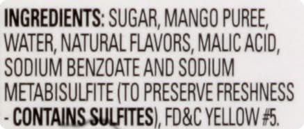 Ingredients: Sugar, Mango Puree, Water, Natural Flavors, Malic Acid, Sodium Benzoate and Sodium Metabisulfite (to Preserve Freshness - Contains Sulfites), FD&C Yellow 5