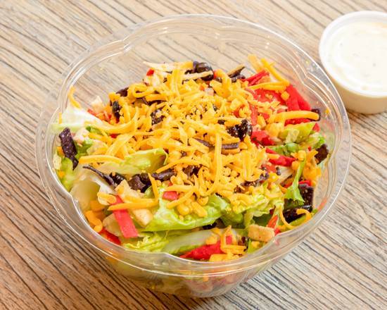 Iceberg, romaine, steak, grilled chicken, red peppers, green peppers, banana peppers, jalapenos, red onion, tortilla strips, fried onions, corn, Cheddar cheese, and a green goddess with a splash of balsamic vinaigrette dressing.