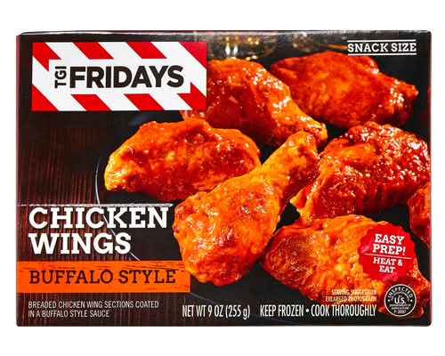 Enjoy your TGI Fridays menu favorites at home with our easy restaurant style appetizers. Ready to heat, TGI Fridays regular Buffalo Style Chicken Wings are a quick and delicious appetizer or party food. Our TGIF crispy breaded chicken wings are topped with buffalo style sauce. Packaged in a box for convenient storage, you can heat our buffalo style wings in a conventional oven or microwave. Store our 9-ounce box of buffalo style chicken wings in the freezer until ready to prepare.