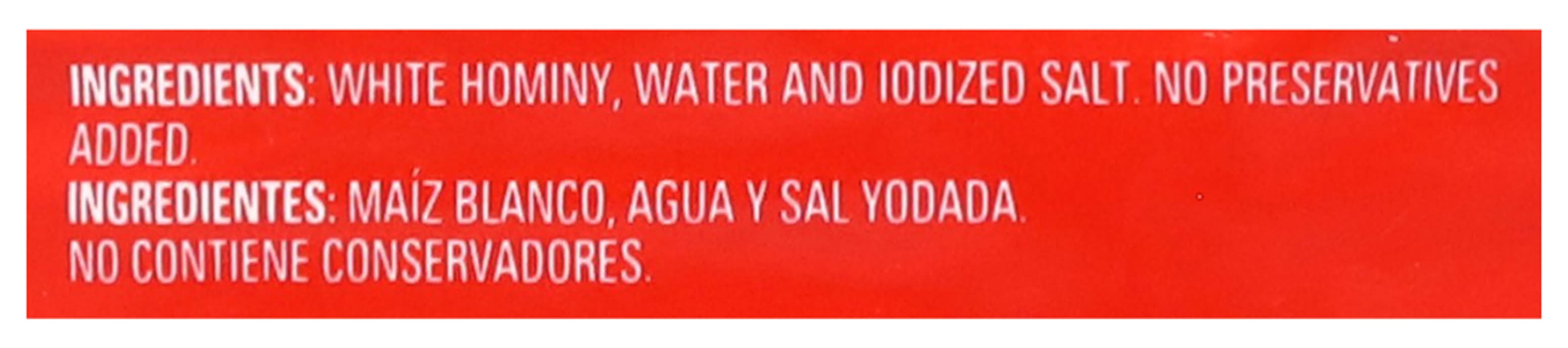Ingredients: White Hominy, Water and Iodized Salt. No Preservatives Added Contains: sulfites.