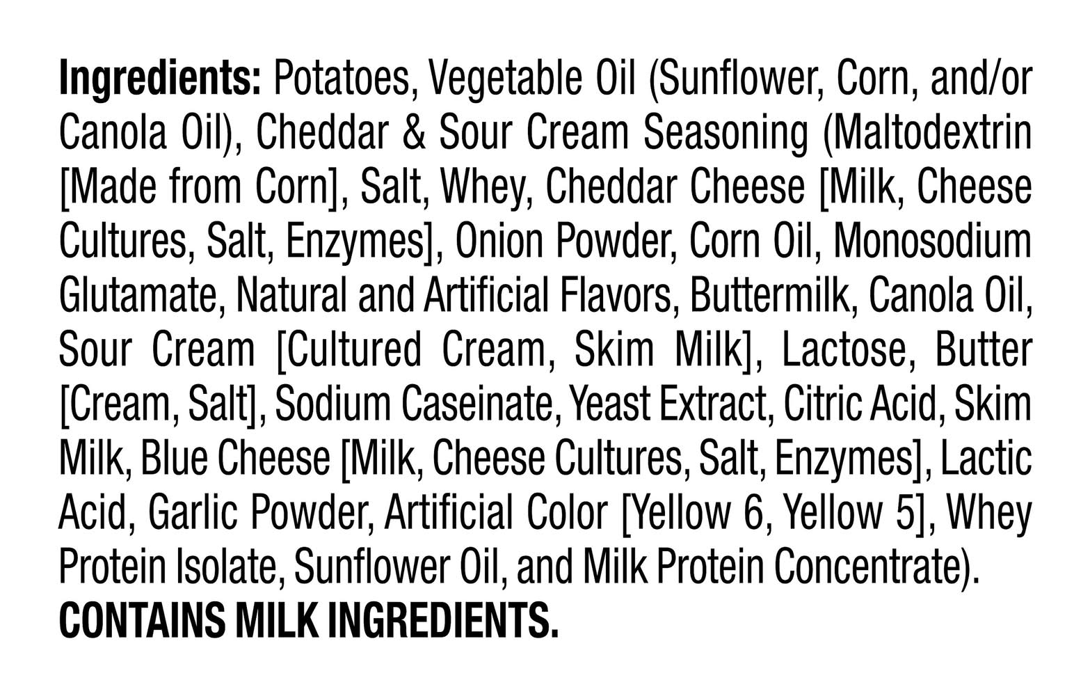 Ingredients: Potatoes, Vegetable Oil (Sunflower, Corn, and/or Canola Oil), Cheddar & Sour Cream Seasoning (Maltodextrin [Made from Corn], Salt, Whey, Cheddar Cheese [Milk, Cheese Cultures, Salt, Enzymes], Onion Powder, Corn Oil, Monosodium Glutamate, Natural and Artificial Flavors, Buttermilk, Canola Oil, Sour Cream [Cultured Cream, Skim Milk], Lactose, Butter [Cream, Salt], Sodium Caseinate, Yeast Extract, Citric Acid, Skim Milk, Blue Cheese [Milk, Cheese Cultures, Salt, Enzymes], Lactic Acid, Garlic Powder, Artificial Color [Yellow 6, Yellow 5], Whey Protein Isolate, Sunflower Oil, and Milk Protein Concentrate) Contains: Milk, Corn, Lactose