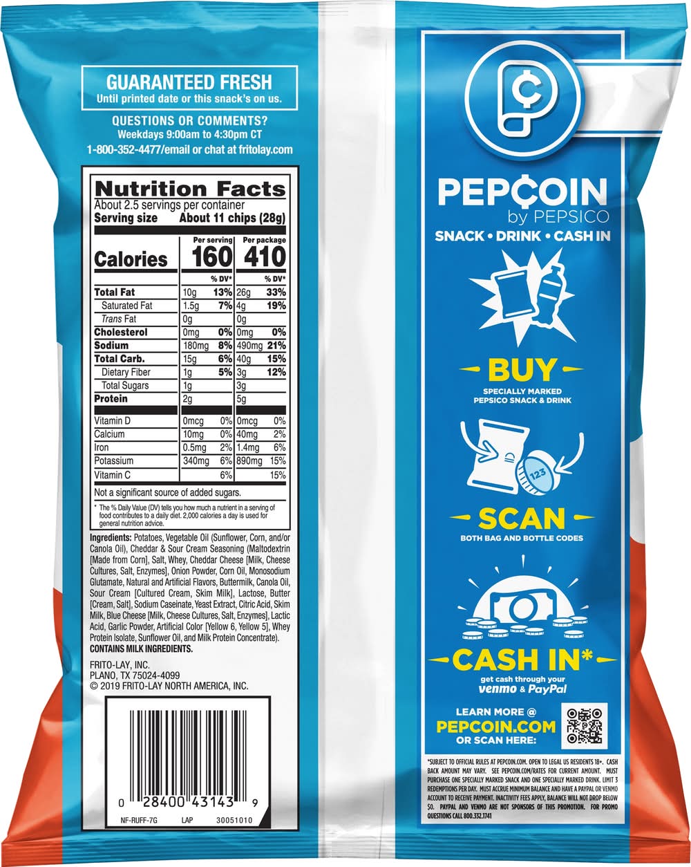 Must purchase one specially marked snack and one specially marked drink. Limit 3 redemptions per day. Must accrue minimum balance and have a paypal or venmo account to receive payment. Inactivity fees apply, Paypal and venmo are not sponsors of this promotion. • Flavor: Cheddar & sour cream • Frito-Lay, Inc., Plano, TX