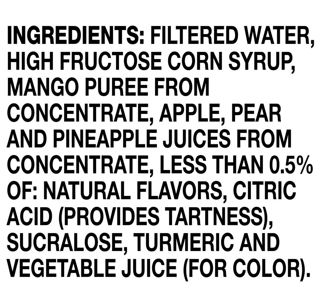 Ingredients: Pure Filtered Water, High Fructose Corn Syrup, Mango Purée From Concentrate, Apple, Pear And Pineapple Juices From Concentrate, Less Than 0.5% Of: Natural Flavors, Citric Acid (Provides Tartness), Sucralose, Turmeric And Vegetable Juice (For Color). Contains: Corn