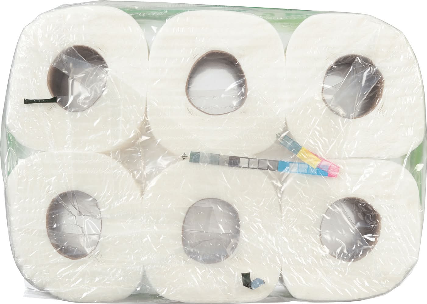 322.8 total sq ft (29.9 sq m) sheets per roll. 70% more 2-ply sheets than the leading brands Unscented double rolls. Comfortable. Affordable. Sustainable. Smart feels good. Septic safe (Based on water dispersibility test results) everywhere. Hey there, smart and economical person who also cares about the planet • Size: 3.9x4 in • Solaris Paper, Inc., 100 S. Anaheim Blvd., Suite 280, Anaheim, CA, 92805 • Packaging: Reusable