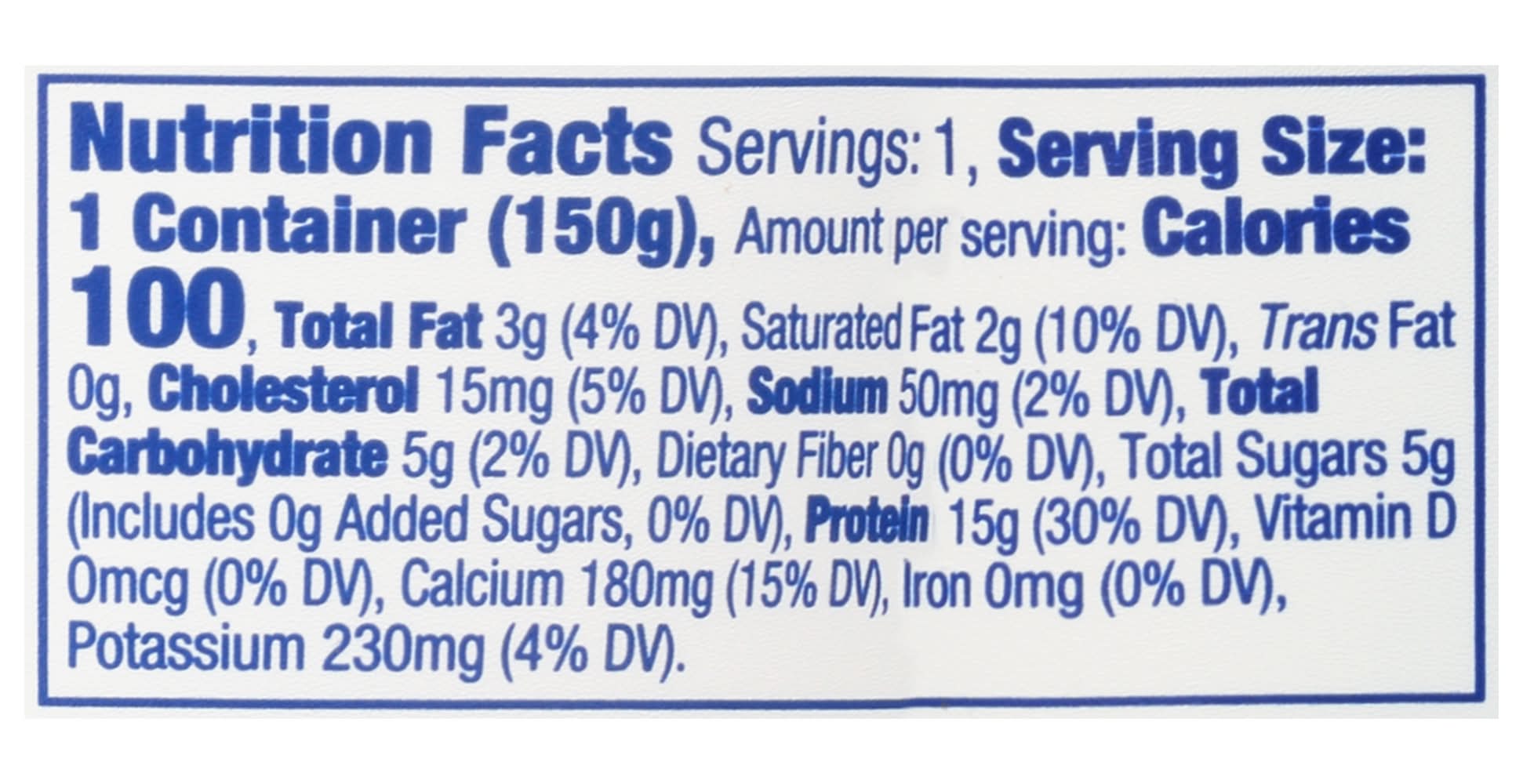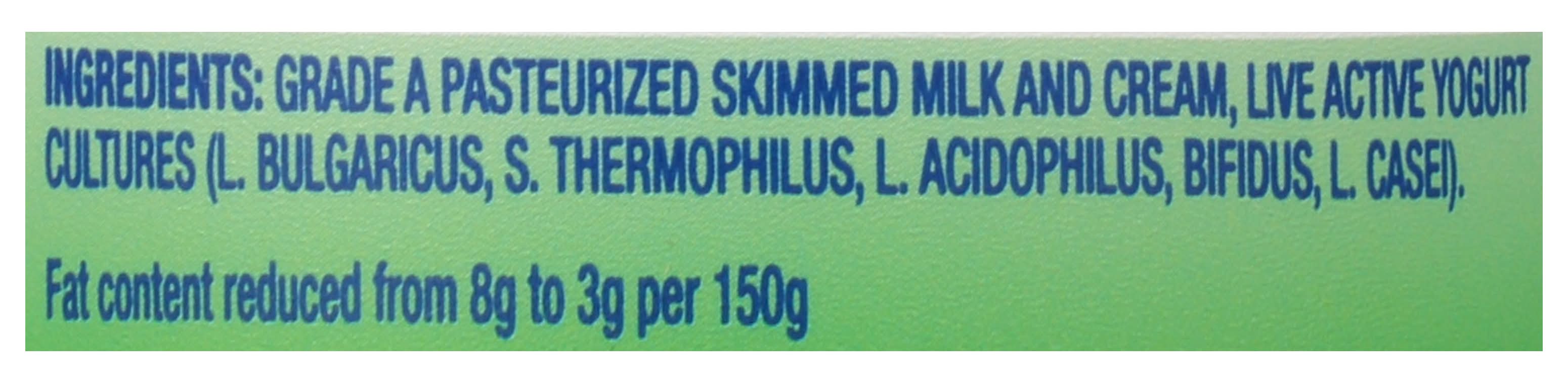 Ingredients: Grade A Pasteurized Skimmed Milk and Cream, Live Active Yogurt Cultures (L. Bulgaricus, S. Thermophilus, L. Acidophilus, Bifidus, L. Casei) Contains: Milk