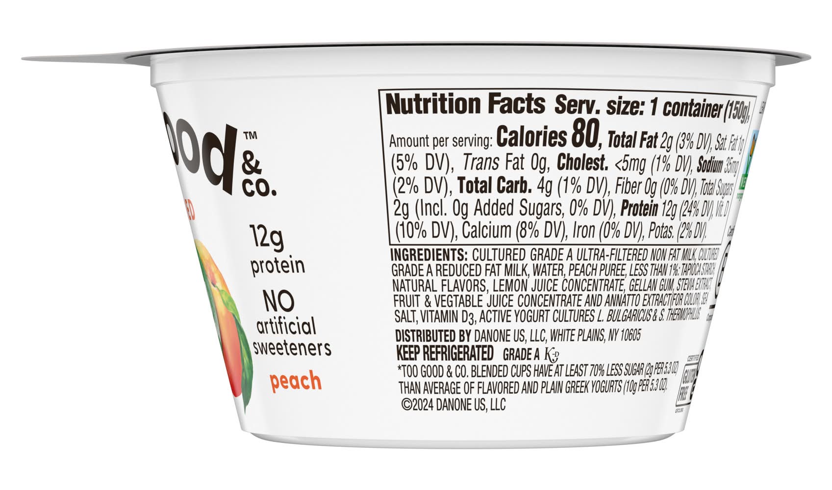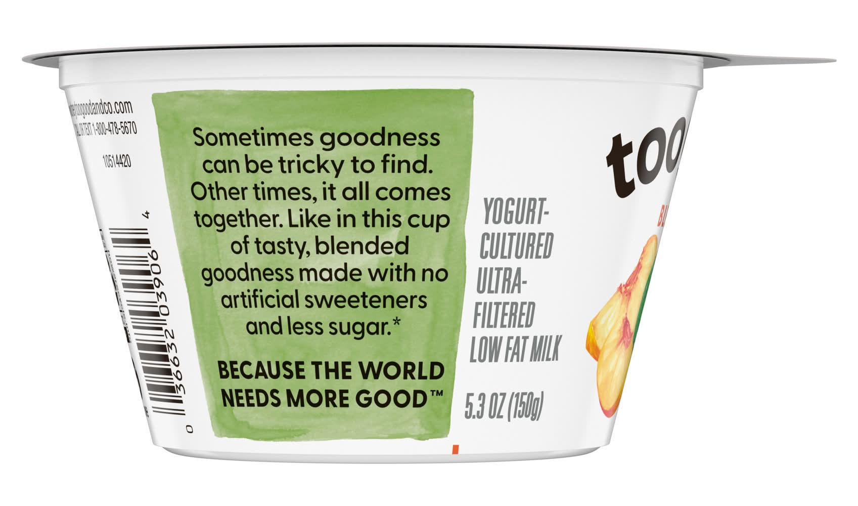 Doing good is about to become a whole lot more delicious with a Too Good & Co. Peach Yogurt-Cultured Ultra-Filtered Low Fat Milk Product. Too Good & Co. is raising the bar on goodness with creamy taste and ingredients you feel good about. Every 5.3 oz serving of this yogurt-cultured dairy product is made with low fat ultra-filtered milk and is delightfully satisfying with 80 calories, 2g of total sugar and 12g of protein. Protein is an essential nutrient we need in our diets, and Too Good & Co. cups are great-tasting, convenient options for adding complete protein goodness every day. Too Good & Co. cups have at least 70% less sugar (2g per 5.3 oz) than average flavored and plain Greek yogurt (10g per 5.3 oz). Too Good & Co. low fat yogurt-cultured ultra-filtered milk makes a great addition to your breakfast and a delightful afternoon snack. Grab a pack for on the go snacks or pack a snack cup for a tasty pick-me-up whenever you need it. Invigorate your day with Too Good & Co. Yogurt-Cultured Ultra-Filtered Milk snack cups. *Not a low calorie food. • Flavor: Peach • Packaging: Reusable