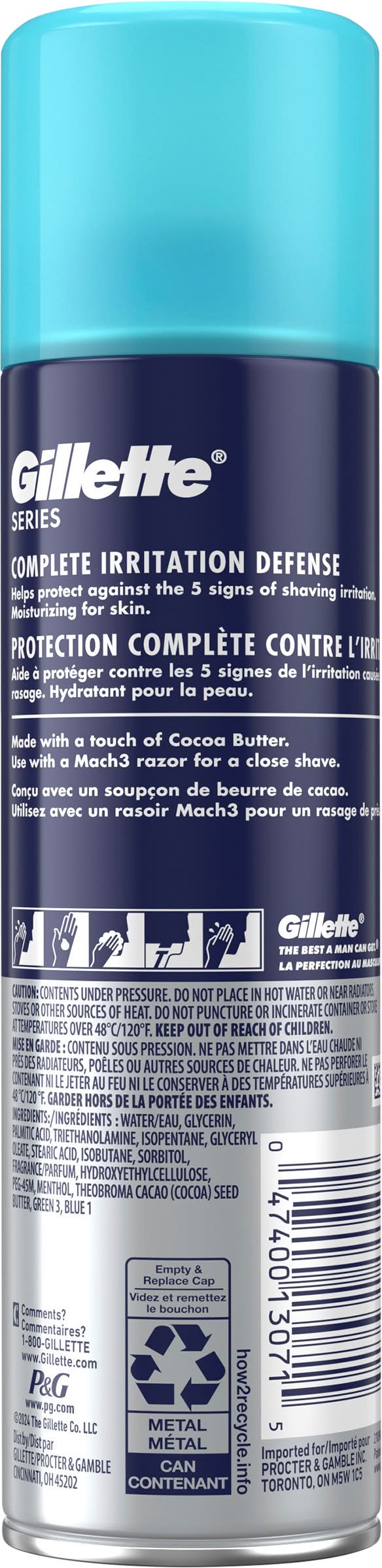 With cocoa butter. Complete Irritation Defense: Helps protect against the 5 signs of shaving irritation. • Gillette/procter & Gamble, Cincinnati, OH, 45202 • Packaging: Reusable