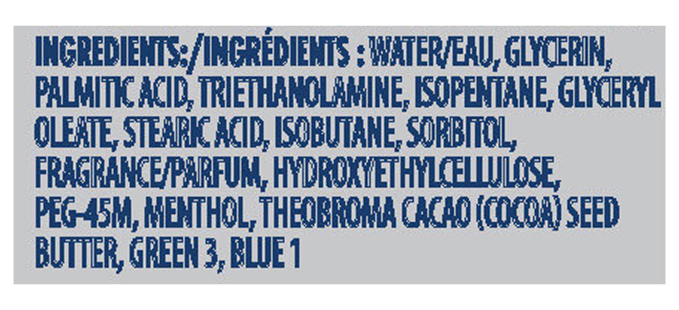 Ingredients: Water/Eau, Glycerin, Palmitic Acid, Triethanolamine, Isopentane, Glyceryl Oleate, Stearic Acid, Isobutane, Sorbitol, Fragrance/Parfum, Hydroxyethylcellulose, PEG-45M, Menthol, Theobroma Cacao (Cocoa) Seed Butter, Green 3, Blue 1