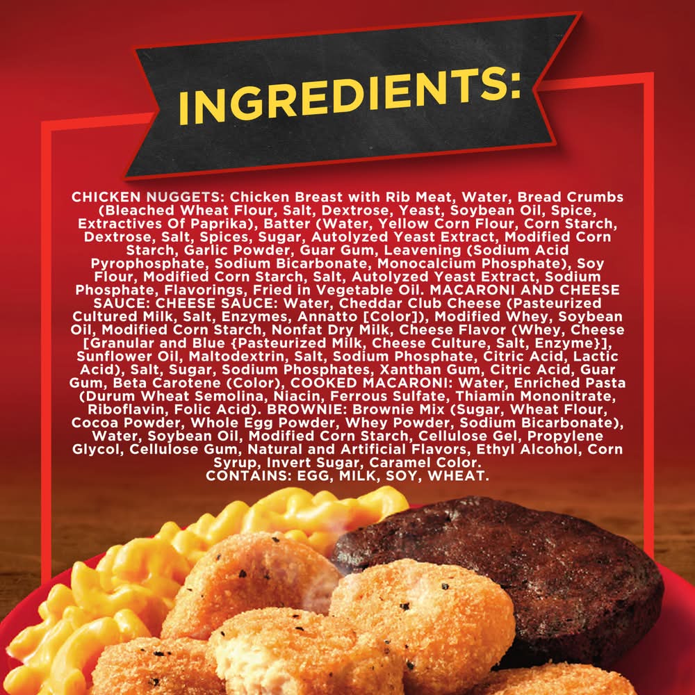 Ingredients: WHITE MEAT CHICKEN NUGGET SHAPED PATTIES: Chicken Breast with Rib Meat, Water, Bread Crumbs (Bleached Wheat Flour, Salt, Dextrose, Yeast, Spice, Extractives of Paprika), Batter (Water, Yellow Corn Flour, Corn Starch, Salt, Spices, Guar Gum, Leavening [Sodium Acid Pyrophosphate, Sodium Bicarbonate, Monocalcium Phosphate], Garlic Powder), Textured Soy Flour, Less Than 2% Of: Modified Corn Starch, Salt, Autolyzed Yeast Extract, Sodium Phosphate, Flavorings. Fried In Vegetable Oil. MACARONI AND CHEESE SAUCE: Cheese Sauce, Water, Cheddar Club Cheese [Pasteurized Cultured Milk, Salt, Enzymes, Annatto {Color}], Modified Whey, Soybean Oil, Modified Corn Starch, Nonfat Dry Milk, Cheese Flavor [Whey, Cheese {Granular and Blue (Pasteurized Milk, Cheese Culture, Salt, Enzyme)}, Sunflower Oil, Maltodextrin, Salt, Sodium Phosphate, Citric Acid, Lactic Acid], Salt, Sugar, Sodium Phosphates, Xanthan Gum, Citric Acid, Guar Gum, Sunflower Oil, Beta Carotene [Color], Cooked Enriched Pasta (Water, Enriched Pasta [Durum Wheat Semolina, Niacin, Iron {Ferrous Sulfate}, Thiamin Mononitrate, Riboflavin, Folic Acid]), . BROWNIE: Brownie Mix (Sugar, Wheat Flour, Cocoa Powder, Whole Egg Powder, Whey Powder, Sodium Bicarbonate), Water, Soybean Oil, Contains 2% or less of: Modified Corn Starch, Cellulose Gel, Propylene Glycol, Cellulose Gum, Natural and Artificial Flavors, Ethyl Alcohol, Corn Syrup, Invert Sugar, Caramel Color. CONTAINS: EGG, MILK, SOY, WHEAT Contains: Egg, Milk, Soy, Wheat
