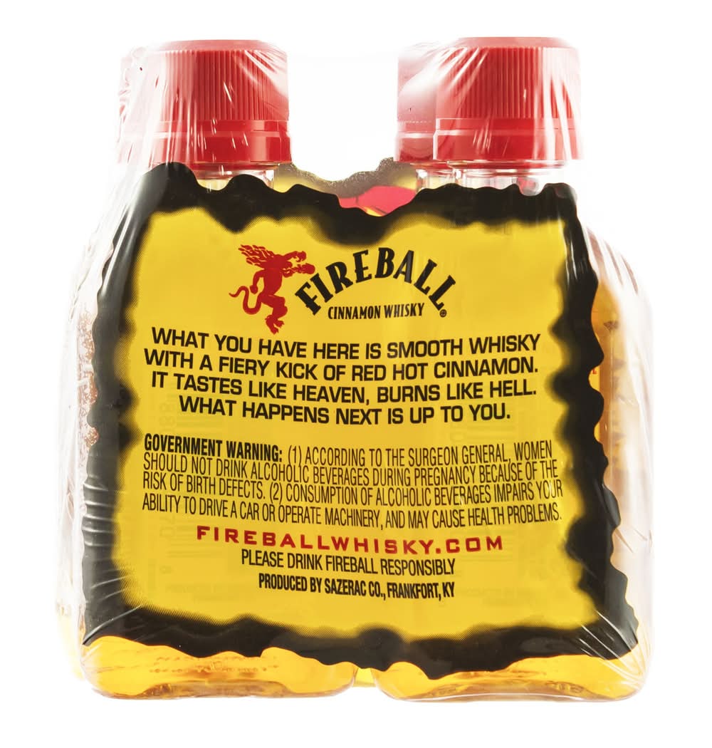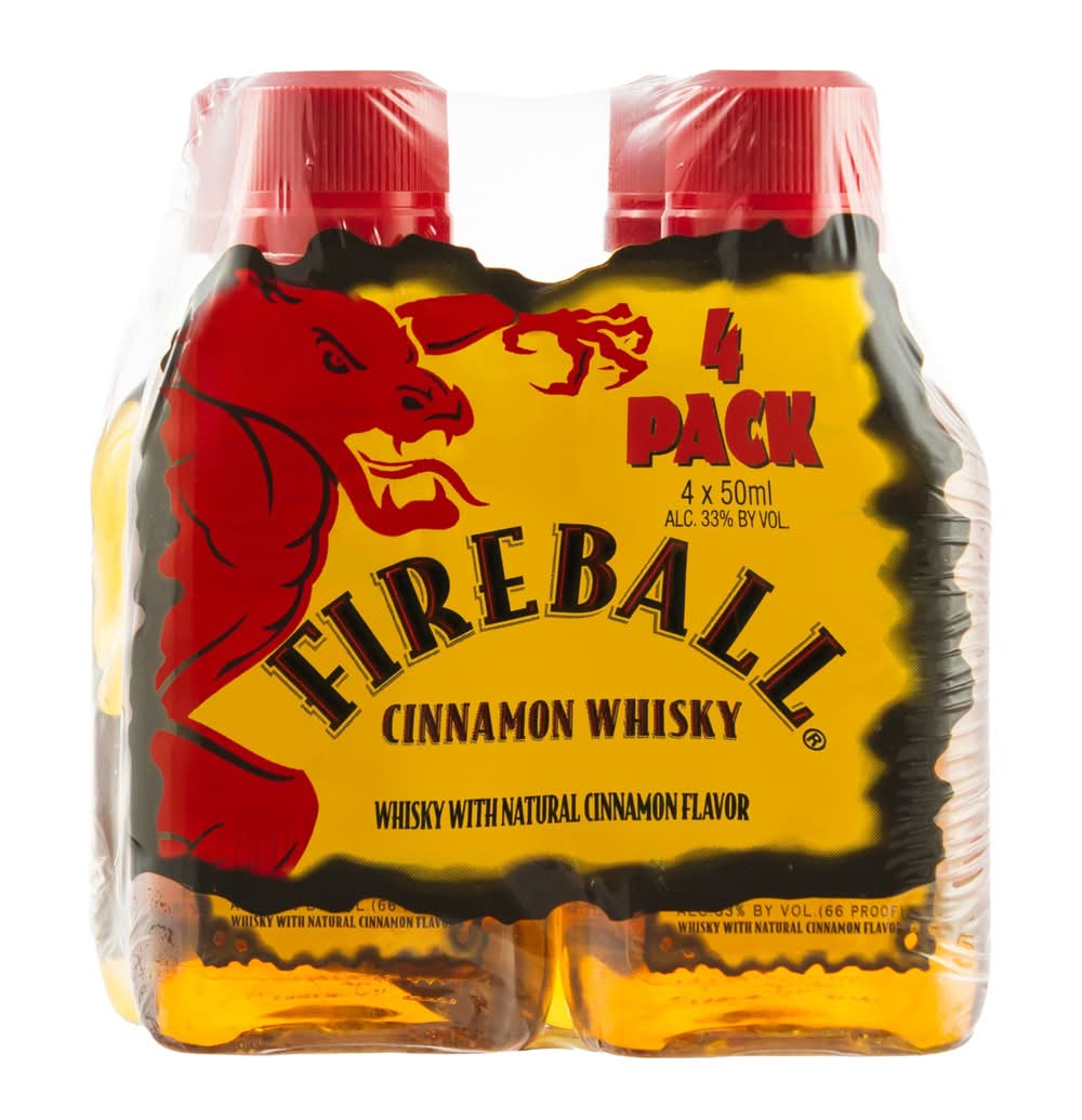 Ignite the Night with the heavenly taste and ferocious burn of Whisky. It is the perfectly blended Canadian whisky made with real cinnamon for a fiery kick of red hot flavor. Making this whisky the iconic choice for celebrating with friends at home or your favorite bar. A shot is the perfect whiskey shot for pregaming before a chill night out. Canadian Whisky also tastes great when enjoyed straight or added to your favorite mixed drinks or a classic cocktail. The cinnamon flare of hard liquor also enhances your favorite hard seltzer, hard cider and other alcoholic drinks. With countless ways to enjoy Whisky, bending the rules is easy - and delicious. Store at room temperature or store and pour straight from your freezer to enjoy an icy, spicy shot. It is one of a kind, not to be replaced by any other copycat cinnamon whiskey. It tastes like heaven and burns like hell. • Brand: Fireball • Category: Flavored whiskey • Flavor: Cinnamon • Pack size: 4 • Alcohol by volume: 33% • Flavor: cinnamon • Liquor color: brown