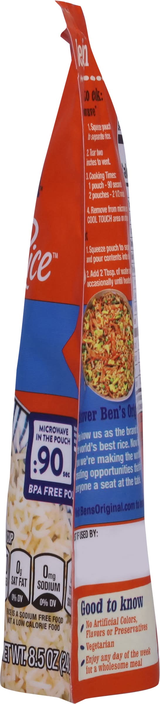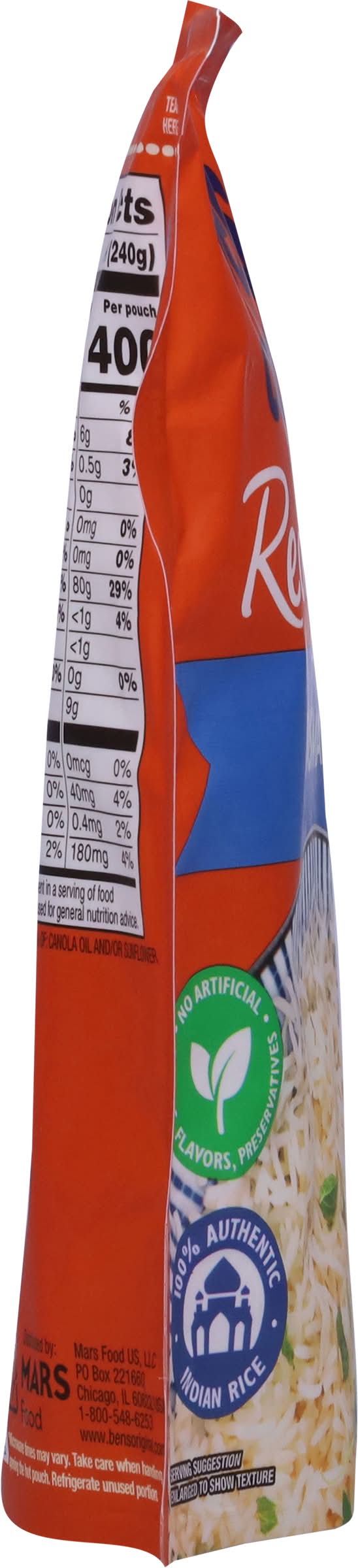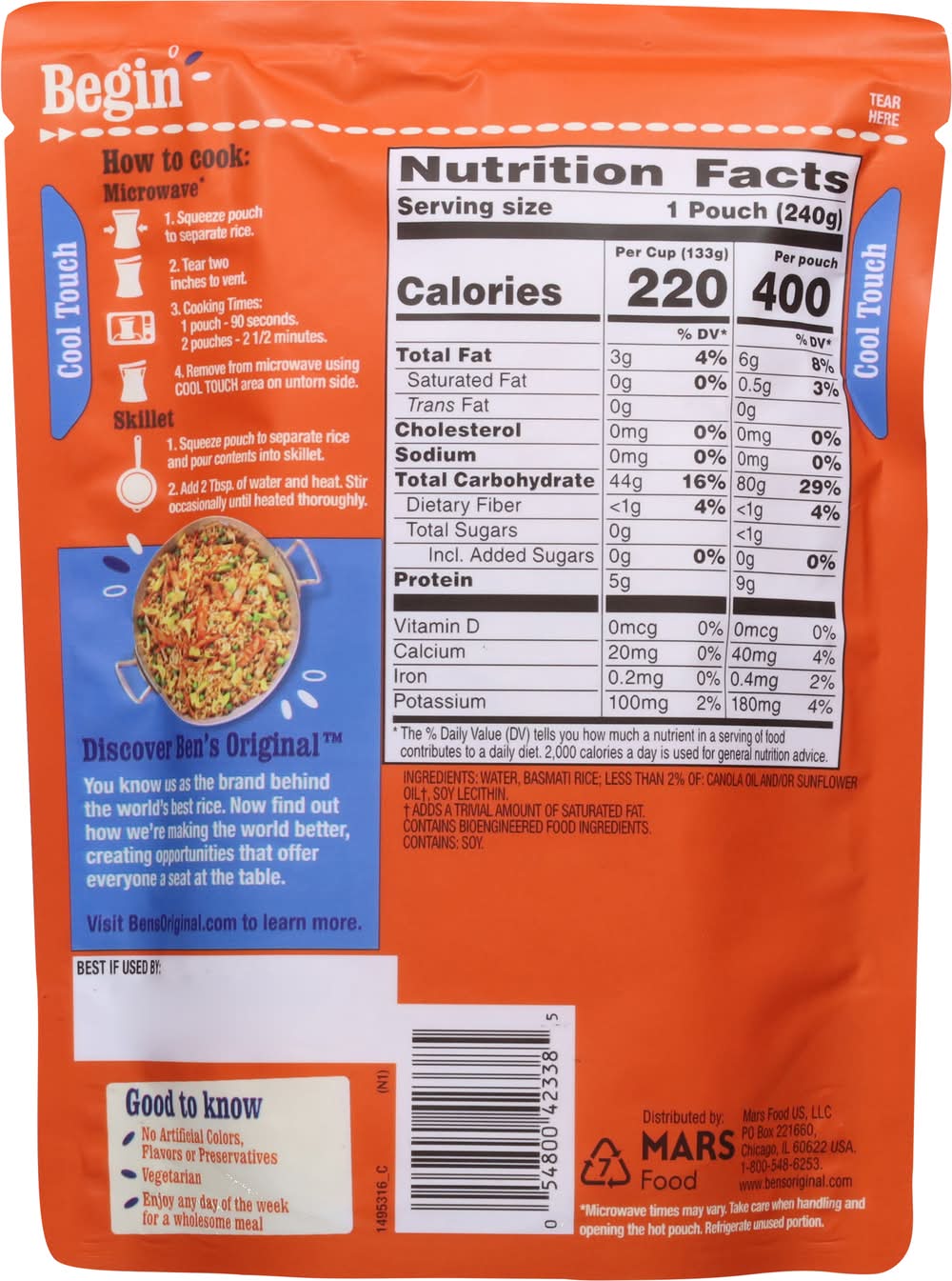 No artificial colors, flavors or preservatives. Per 1 Cup: 220 calories; 0 g sat fat (0% DV); 0 mg sodium (0% DV); 0 g total sugars. Rice is a sodium free food. Not a low calorie food. Vegetarian Contains bioengineered food ingredients. 100% Authentic Indian rice. Microwave in the pouch: 90 sec. Begin. Discover Ben's Original: You know us as the brand behind the world's best rice. Now find out how we're making the world better, creating opportunities that offer everyone a seat at the table. Good to Know. Enjoy any day of the week for a wholesome meal. BPA free pouch. Made in Canada. • Mars food US, LLC, PO Box 221660,Chicago,IL,60622,USA • Packaging: Reusable