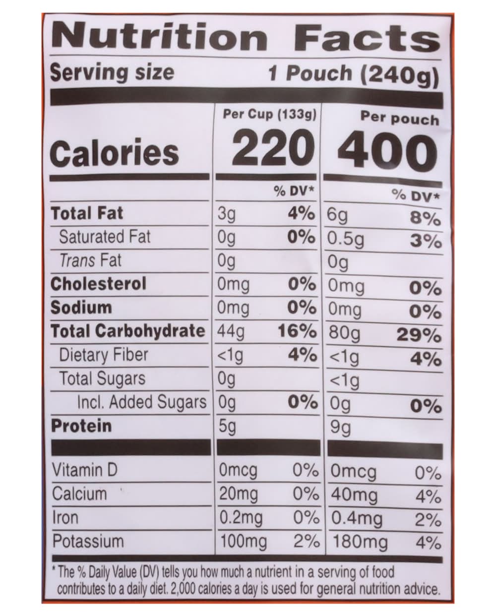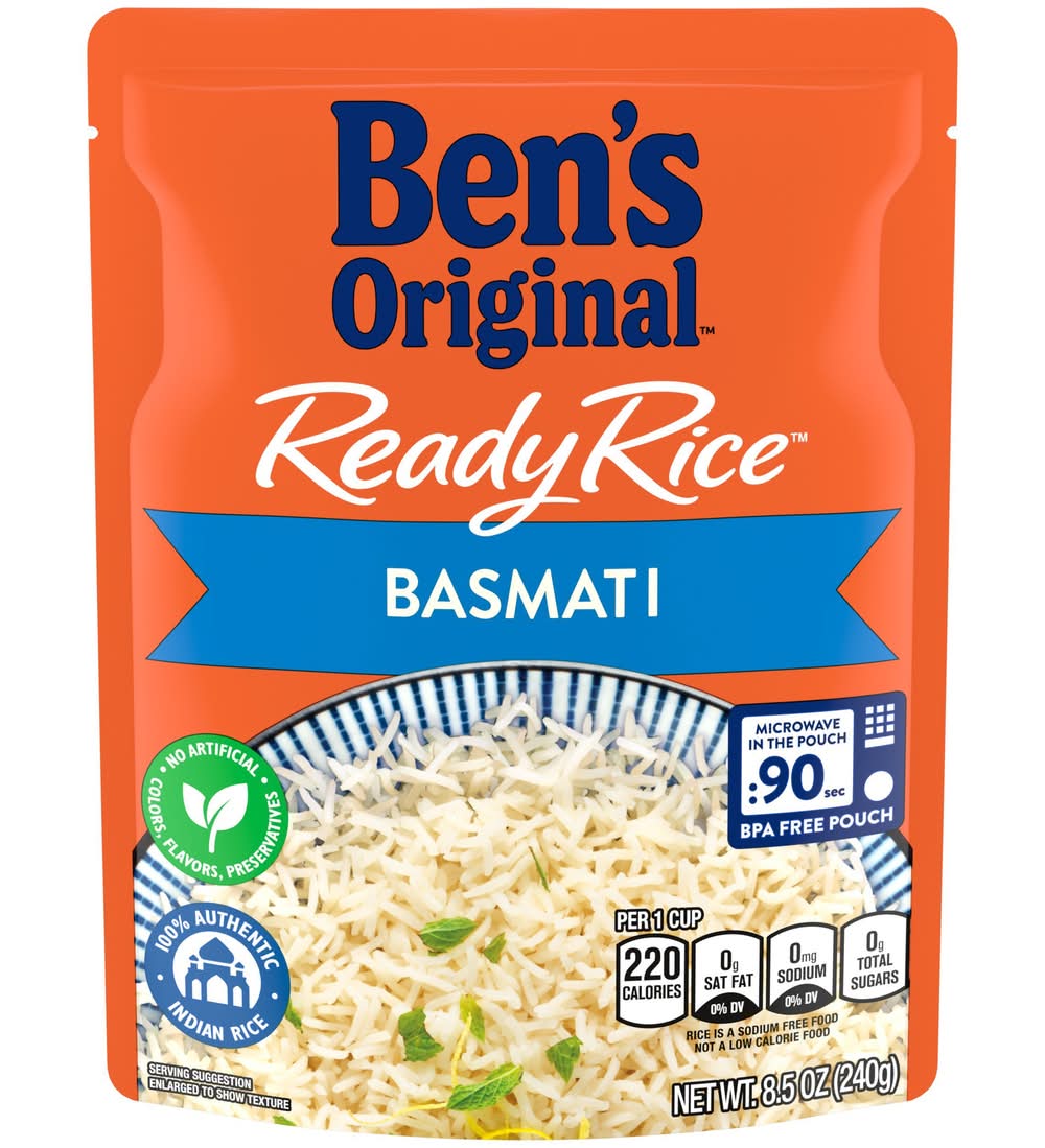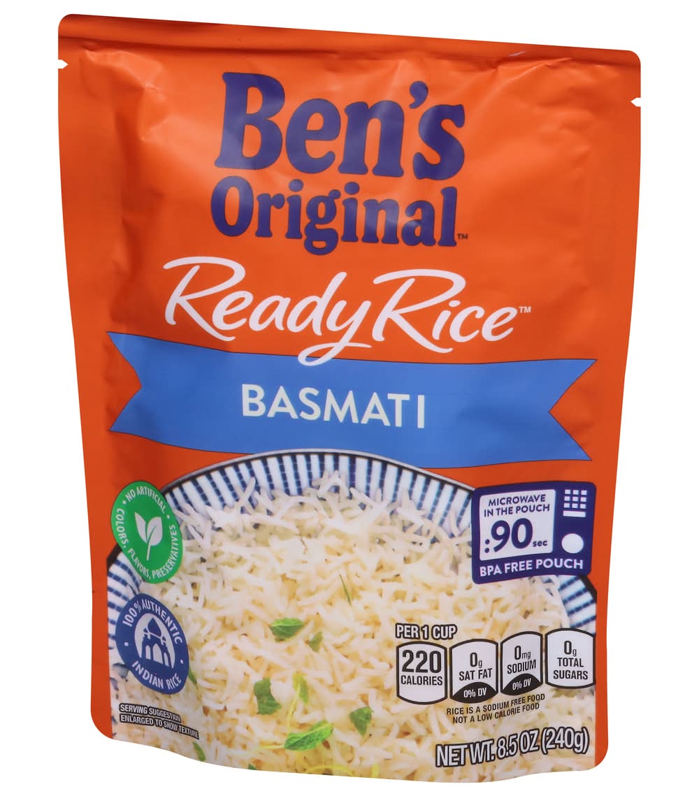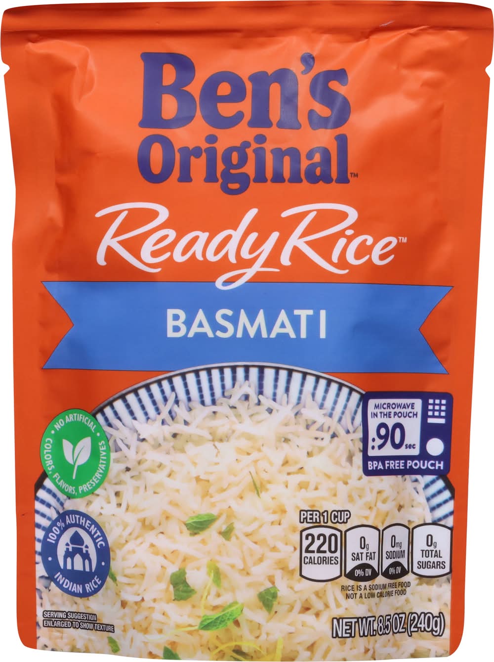 No artificial colors, flavors or preservatives. Per 1 Cup: 220 calories; 0 g sat fat (0% DV); 0 mg sodium (0% DV); 0 g total sugars. Rice is a sodium free food. Not a low calorie food. Vegetarian Contains bioengineered food ingredients. 100% Authentic Indian rice. Microwave in the pouch: 90 sec. Begin. Discover Ben's Original: You know us as the brand behind the world's best rice. Now find out how we're making the world better, creating opportunities that offer everyone a seat at the table. Good to Know. Enjoy any day of the week for a wholesome meal. BPA free pouch. Made in Canada. • Mars food US, LLC, PO Box 221660,Chicago,IL,60622,USA • Packaging: Reusable