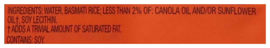 Ingredients: Water, Basmati Rice; Less than 2% of: Canola Oil and/or Sunflower Oil Adds a Trivial Amount of Saturated Fat, Soy Lecithin. Contains: Contains soy. Additives: Genetically Modified Ingredients