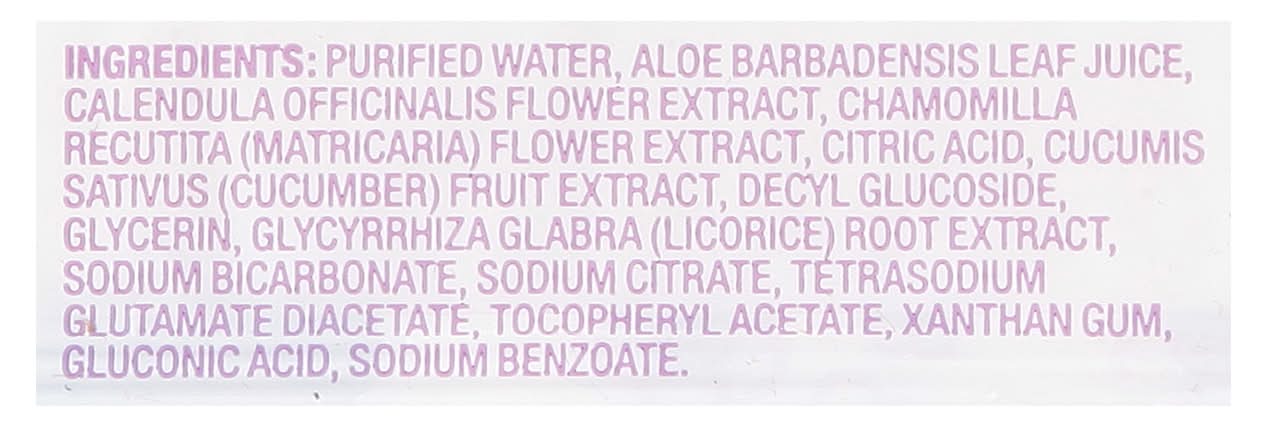Ingredients: Purified Water, Aloe Barbadensis Leaf Juice, Calendula Officinalis Flower Extract, Chamomilla Recutita (Matricaria) Flower Extract, Citric Acid, Cucumis Sativus (Cucumber) Fruit Extract, Decyl Glucoside, Glycerin, Glycyrrhiza Glabra (Licorice) Root Extract. Sodium Bicarbonate, Sodium Citrate, Tetrasodium Glutamate Diacetate, Tocopheryl Acetate, Xanthan Gum, Gluconic Acid, Sodium Benzoate