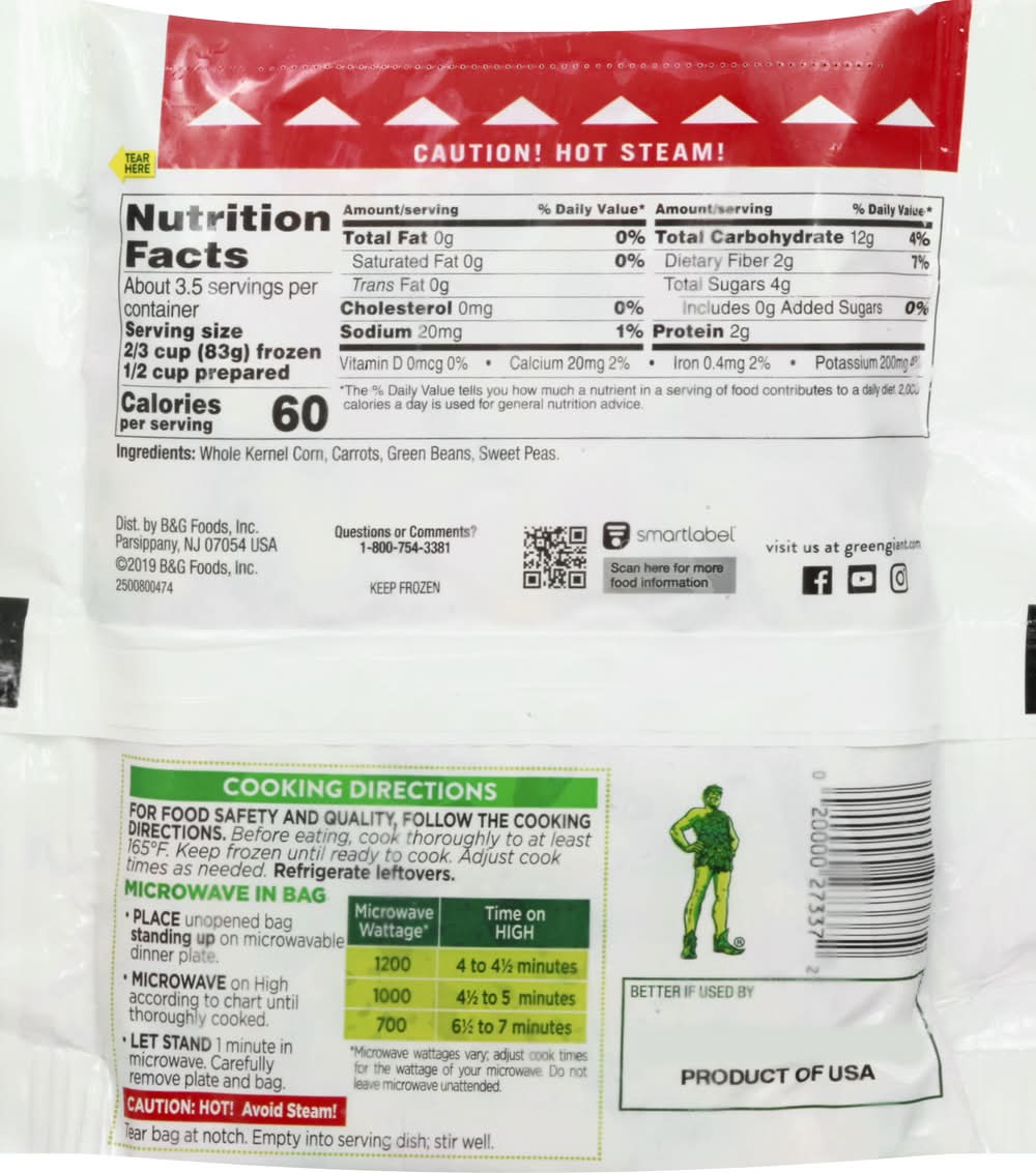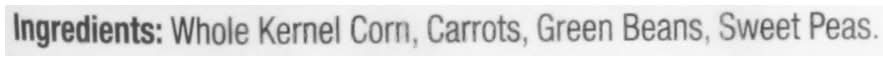 Ingredients: Whole Kernel Corn, Carrots, Green Beans, Sweet Peas