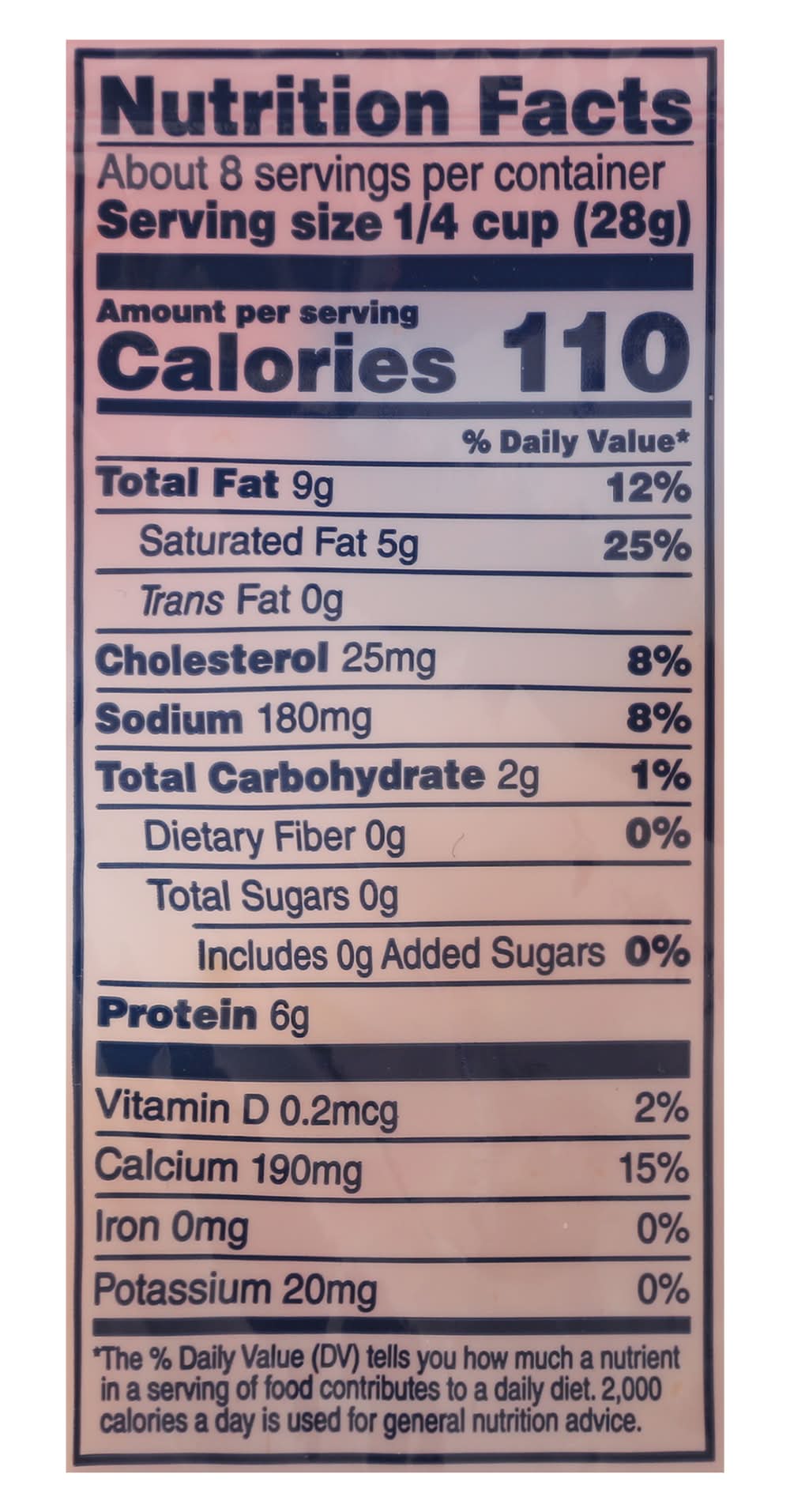 Ingredients: Cheddar Cheese (Cultured Pasteurized Milk, Salt, Enzymes, Annatto [Color]), Anti-Caking Blend (Potato Starch, Tapioca Starch, Natamycin [Mold Inhibitor]). Contains: Milk