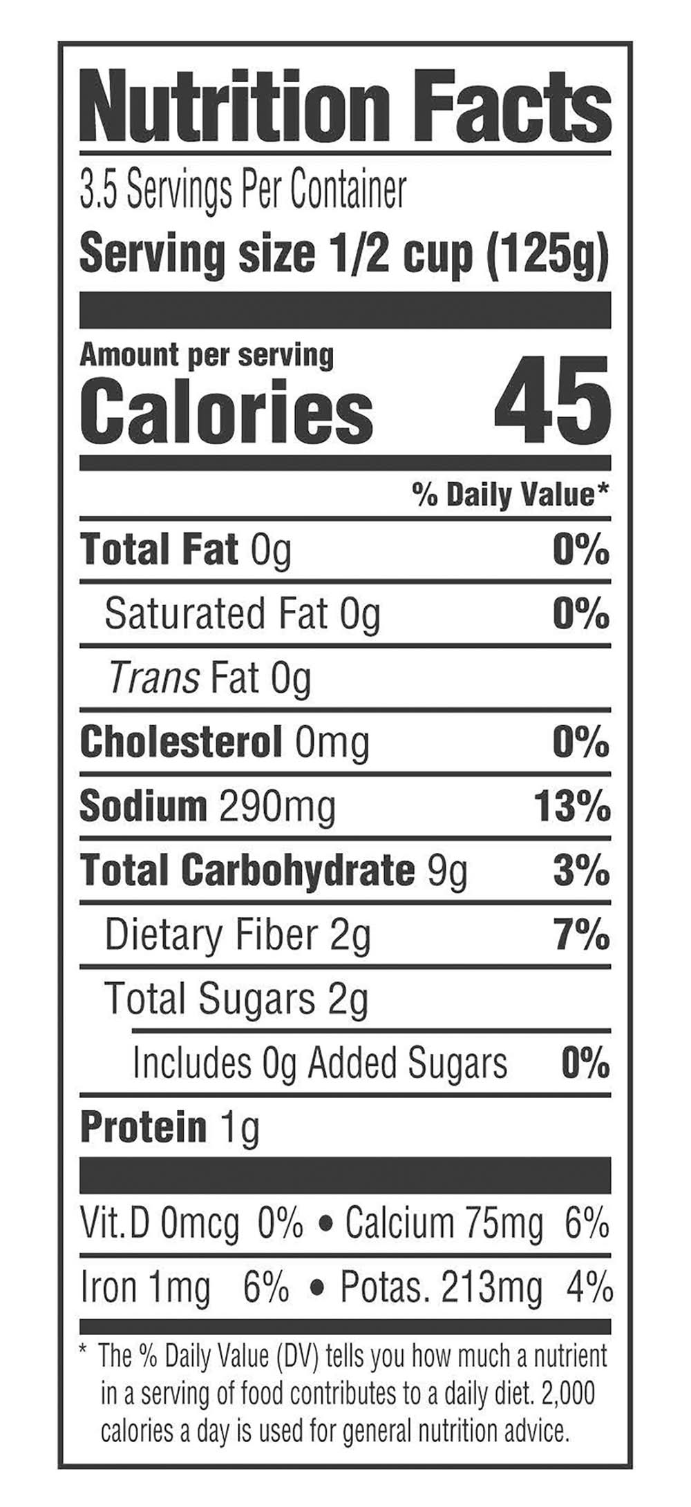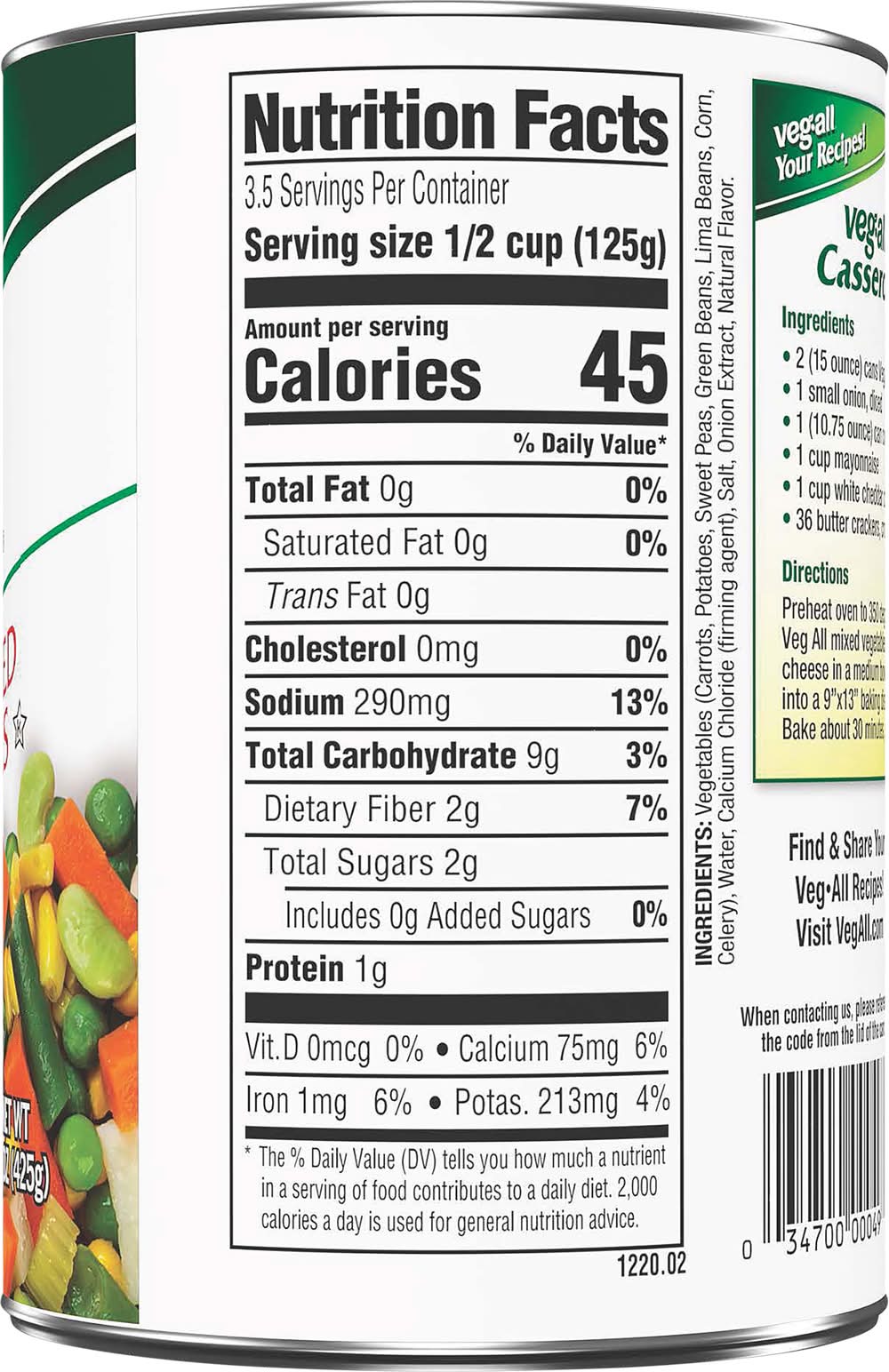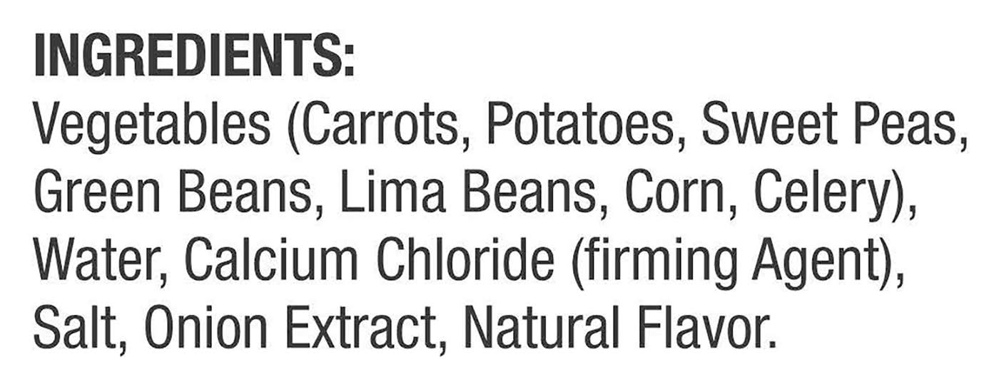 Ingredients: Vegetables (Carrots, Potatoes, Sweet Peas, Green Beans, Lima Beans, Corn, Celery), Water, Calcium Chloride (Firming Agent), Salt, Onion Extract, Natural Flavor Contains: Corn, Celery
