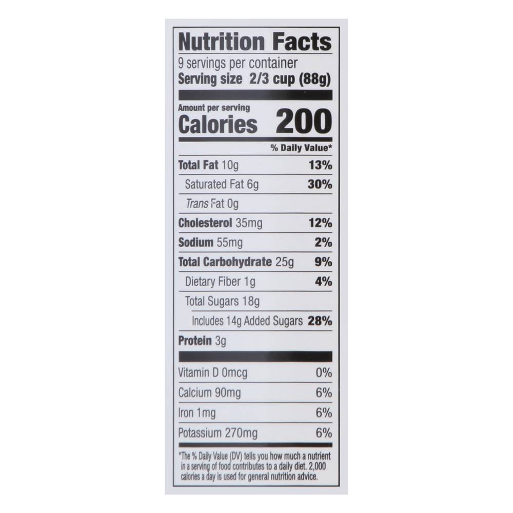 Ingredients: Milk, Cream, Sugar, Chocolate Variegate (Corn Syrup, Water, Sugar, Modified Corn Starch, Cocoa Processed with Alkali, Salt, Nonfat Dry Milk, Carrageenan, Natural Flavors, Potassium Sorbate, Citric Acid), Brownie Bits (Wheat Flour, Powdered Sugar [Sugar, Corn Starch), Palm and Palm Kernel Oils, Sugar, Water, Cocoa Processed with Alkali, High Fructose Corn Syrup, Enriched Flour (Wheat Flour, Niacin, Reduced Iron, Thiamine Mononitrate, Riboflavin, Folic Acid], Maltodextrin, Natural Flavors, Soybean Oil, Salt, Corn Flour, Dextrose, Sodium Bicarbonate and Soy Lecithin), Corn Syrup, Cocoa Powder (Processed with Alkali), Whey, Cocoa Liquor, Mono-and Diglycerides, Guar Gum, Locust Bean Gum, Polysorbate 80, Carrageenan. Contains: Milk, Wheat, Soybeans, Eggs, Peanuts, Tree Nuts