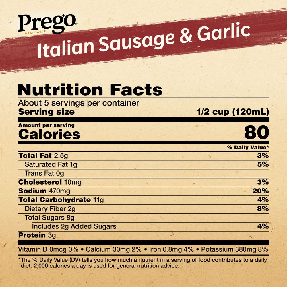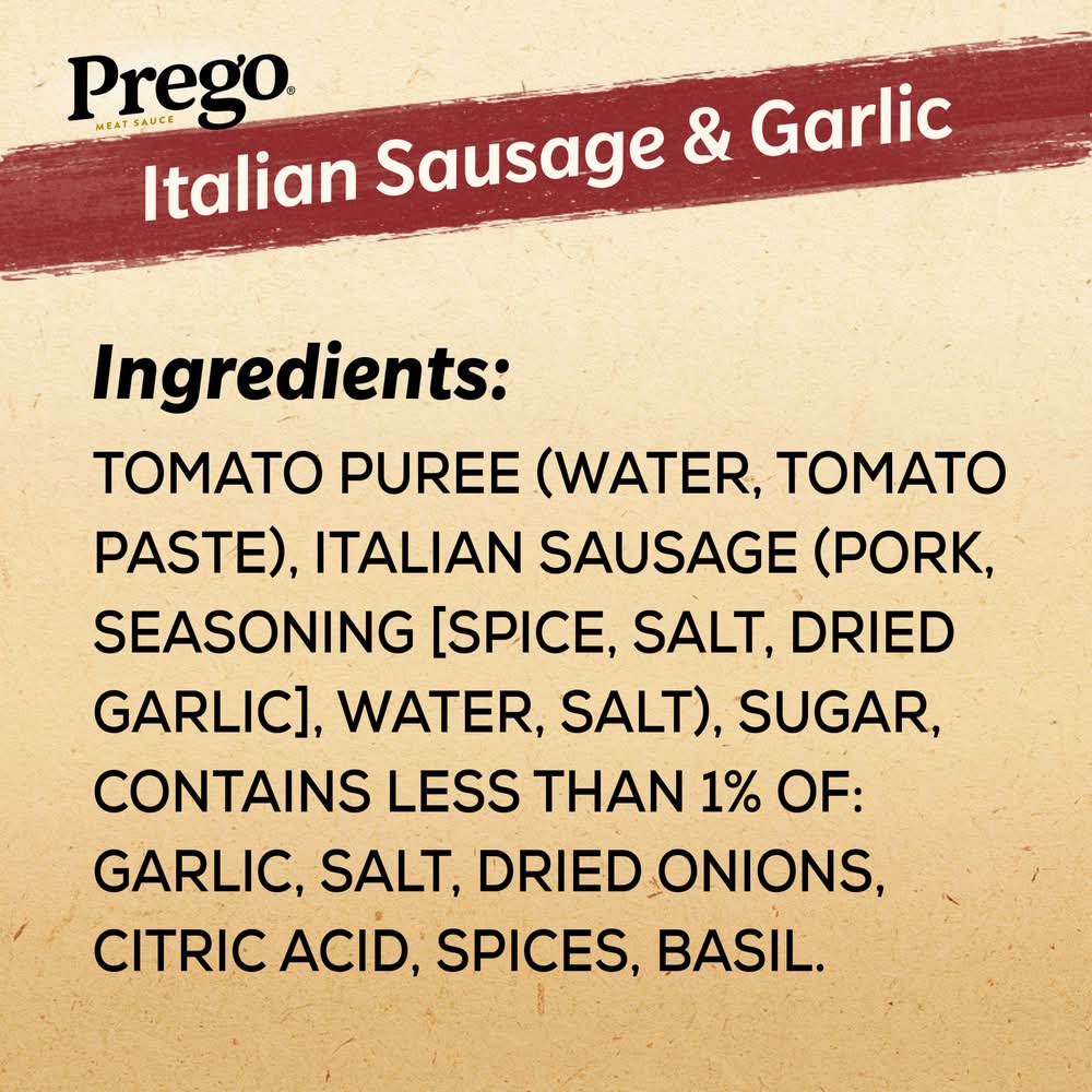 Bring everyone to the table with Prego Italian Sausage and Garlic Meat Sauce, a pasta sauce crafted with tasty ingredients that's made to share with the ones you love. It's the red sauce that brings delicious flavor to every meal, making ordinary meals extraordinary. • Flavor: Italian sausage & garlic • Campbell soup, Camden, NJ 08103-1701,Phone;888-FOR-PREGO • Packaging: Reusable