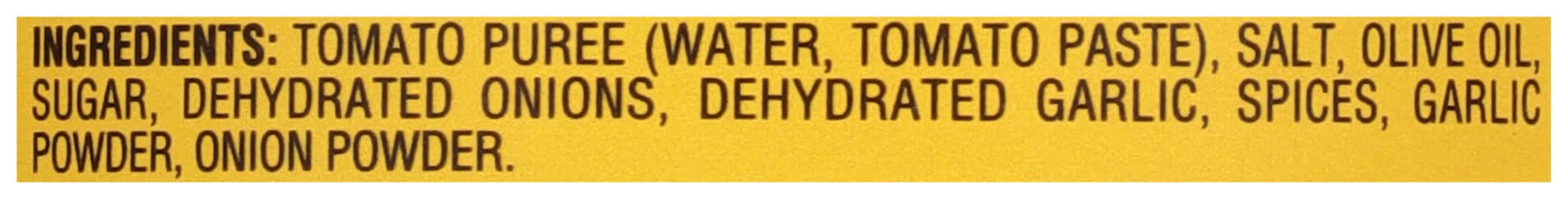 Ingredients: Tomato Puree (Water, Tomato Paste), Salt, Olive Oil, Sugar, Dehydrated Onions, Dehydrated Garlic, Spices, Garlic Powder, Onion Powder