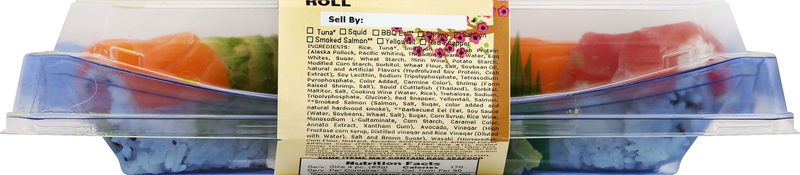 Ingredients: Rice, Tuna (Tuna Treated with Carbon Monoxide (a Preservative) to Promote Color Retention), Imitation Crab (Fish Protein (Alaska Pollock, Pacific Whiting, Threadfin Bream), Water, Egg Whites, Sugar, Wheat Starch, Mirin Wine, Potato Starch, Modified Corn Starch, Sorbitol, Wheat Flour, Salt, Soybean Oil, Natural and Artificial Flavors (Hydrolyzed Soy Protein, Crab Extract), Soy Lecithin, Sodium Tripolyphosphate, Tetrasodium Pyrophosphate, Color Added, Carmine Color), Shrimp (Farm Raised Shrimp, Salt), Squid (Cuttlefish (Thailand), Sorbitol, Maltitor, Salt, Cooking Wine (Water, Rice), Trehalose, Sodium, Tripolyphosphate, Glycine), Red Snapper, Yellowtail, Salmon, Smoked Salmon (Salmon, Salt, Sugar, Color Added and Natural Hardwood Smoke), Barbecued Eel (Eel, Sov Sauce (Water, Soybeans, Wheat, Salt), Sugar, Corn Syrup, Rice Wine, Monosodium L-Glutaminate, Corn Starch, Caramel Color, Annato Extract, Xanthan Gum), Avocado, Vinegar (High Fructose Corn Syrup, Distilled Vinegar and Rice Vinegar (Diluted with Water), Salt and Brown Sugar), Wasabi (Horseradish, Corn Flour, Mustard, Ascorbic Acid (Vitamin C), Artificial Flavor, Artificial Color (FD&C Yellow 5, FD&C Blue 1)), Pickled Ginger (Ginger, Water, Vinegar, Salt, Acetic Acid, Citric Acid, Corn Syrup, Sorbitol, Aspartame, Potassium Sorbate, FD&C Red 40), Seaweed, Sesame Seed Contains: Eggs, Fish, Soybeans, Wheat