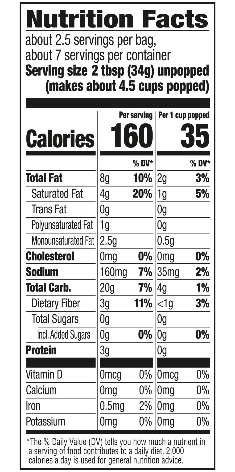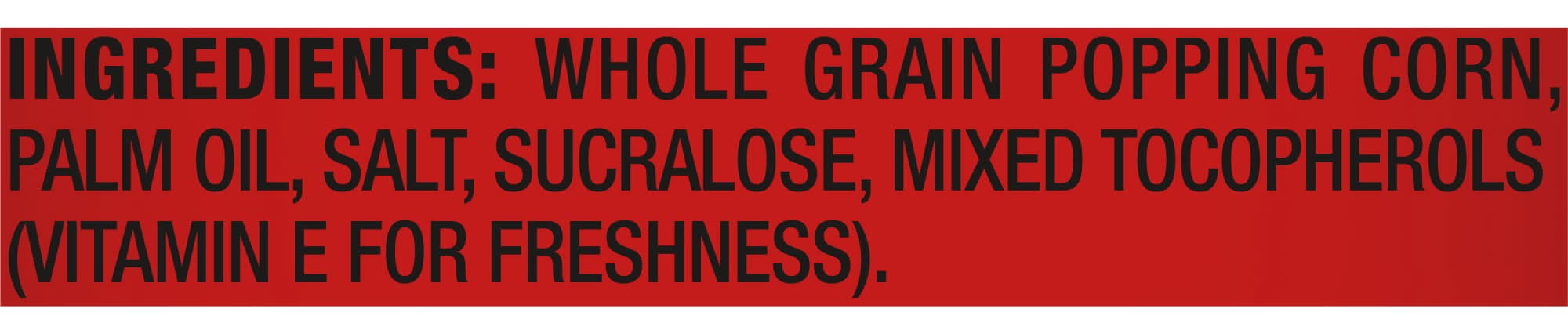 Ingredients: Whole Grain Popping Corn, Palm Oil, Salt, Sucralose, Mixed Tocopherols (Vitamin E for freshness), .