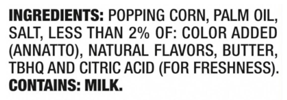 Ingredients: Popping Corn, Palm Oil, Salt, Less than 2% of: Color Added (Annatto), Natural Flavor, Butter, TBHQ and Citric Acid (for Freshness) Contains: Milk, Corn