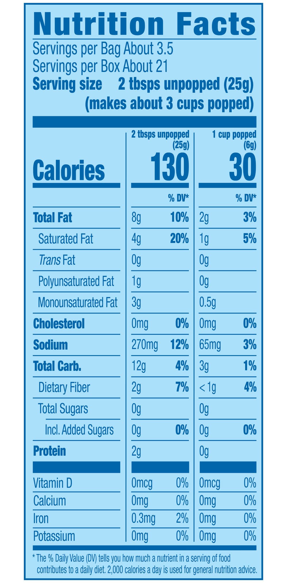 Ingredients: INGREDIENTS: POPCORN, PALM OIL, SALT, NATURAL FLAVOR (MILK), ROSEMARY EXTRACT (FOR FRESHNESS), ANNATTO EXTRACT (COLOR), PAPRIKA EXTRACT (COLOR), LACTIC ACID. CONTAINS: MILK Contains: CONTAINS: Milk/Dairy